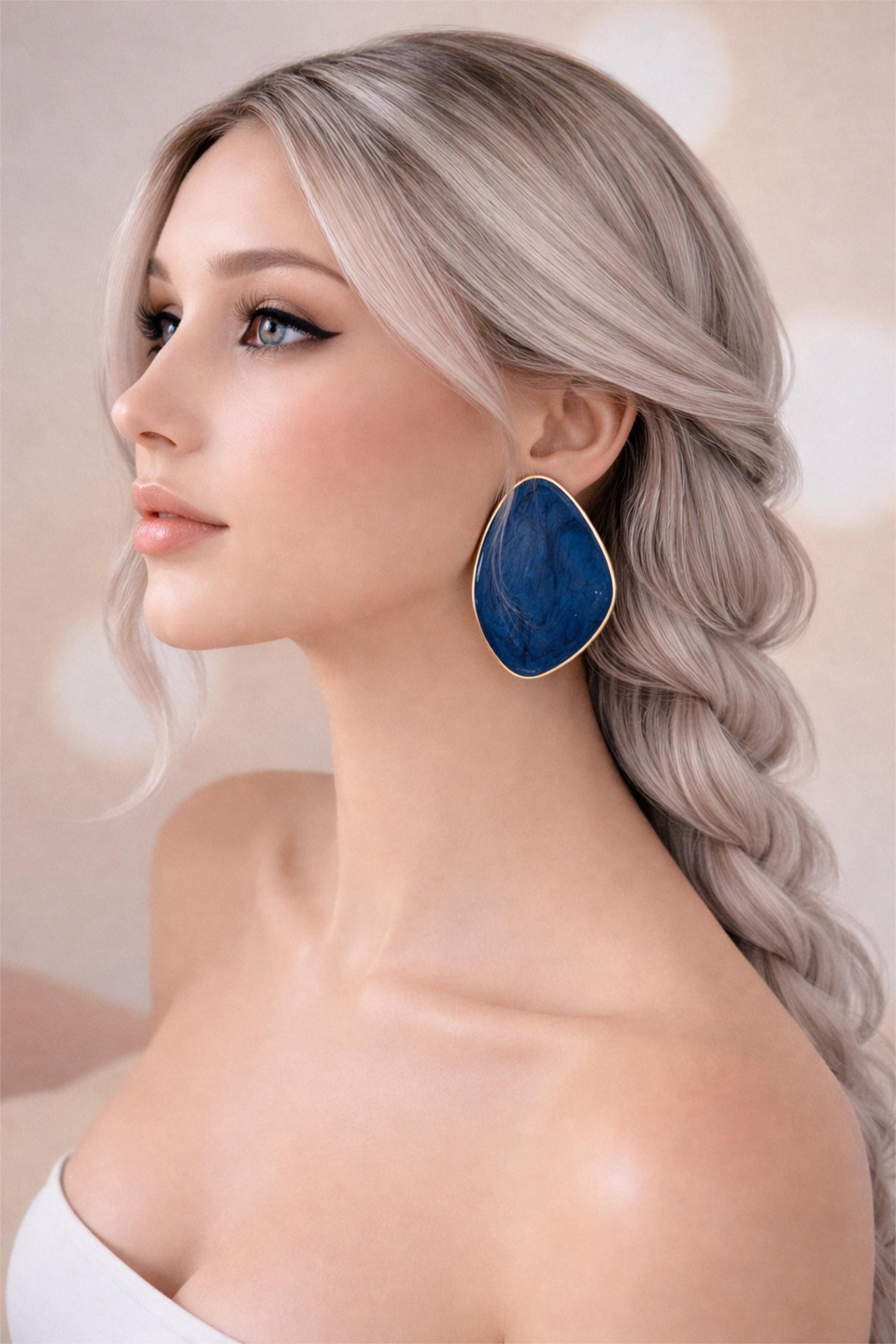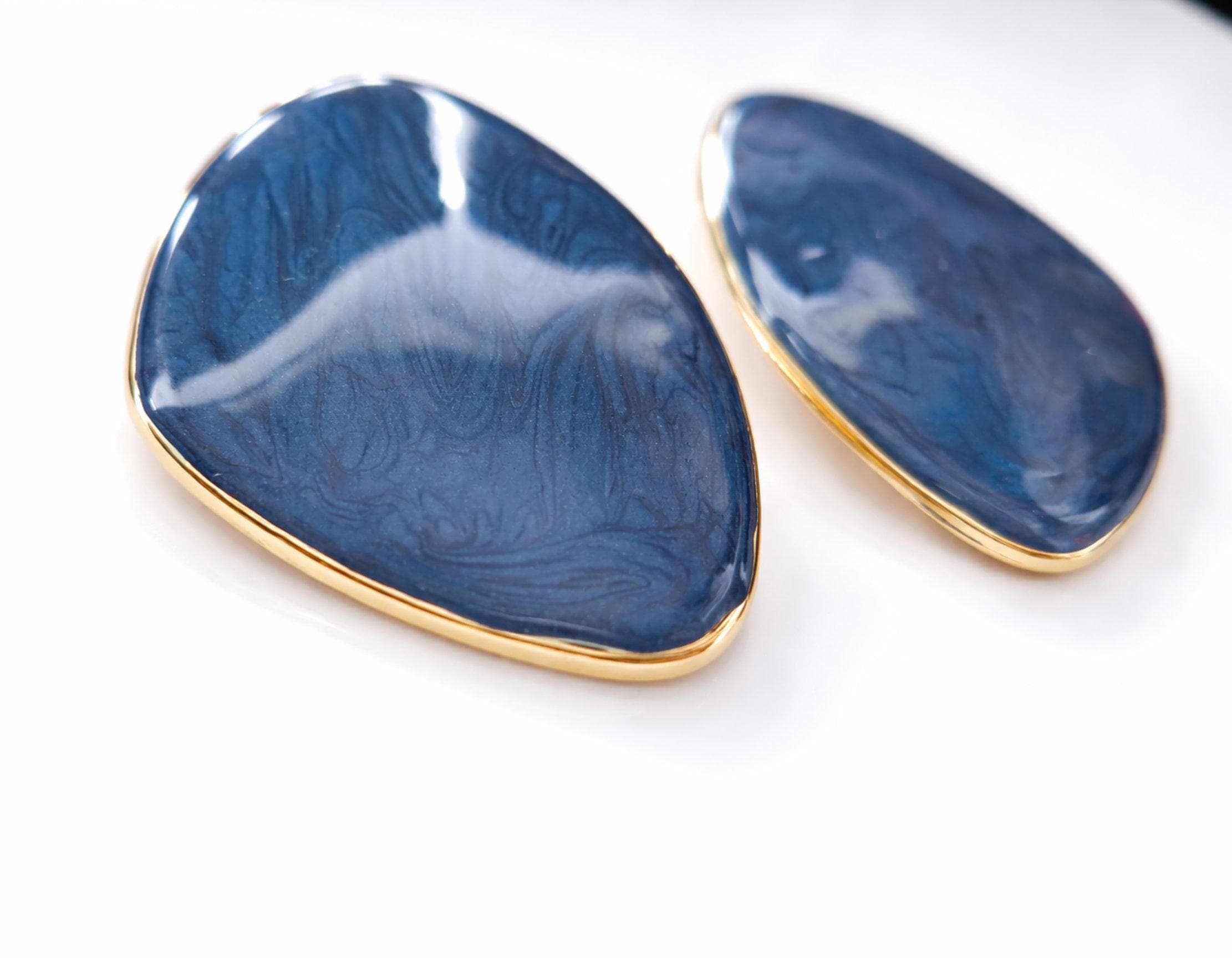 These bold teardrop earrings feature a beautifully marbled Deep Slate Blue enamel design, finished with a sleek gold-tone surround. Each pair has its own unique swirl pattern, making them truly one of a kind.