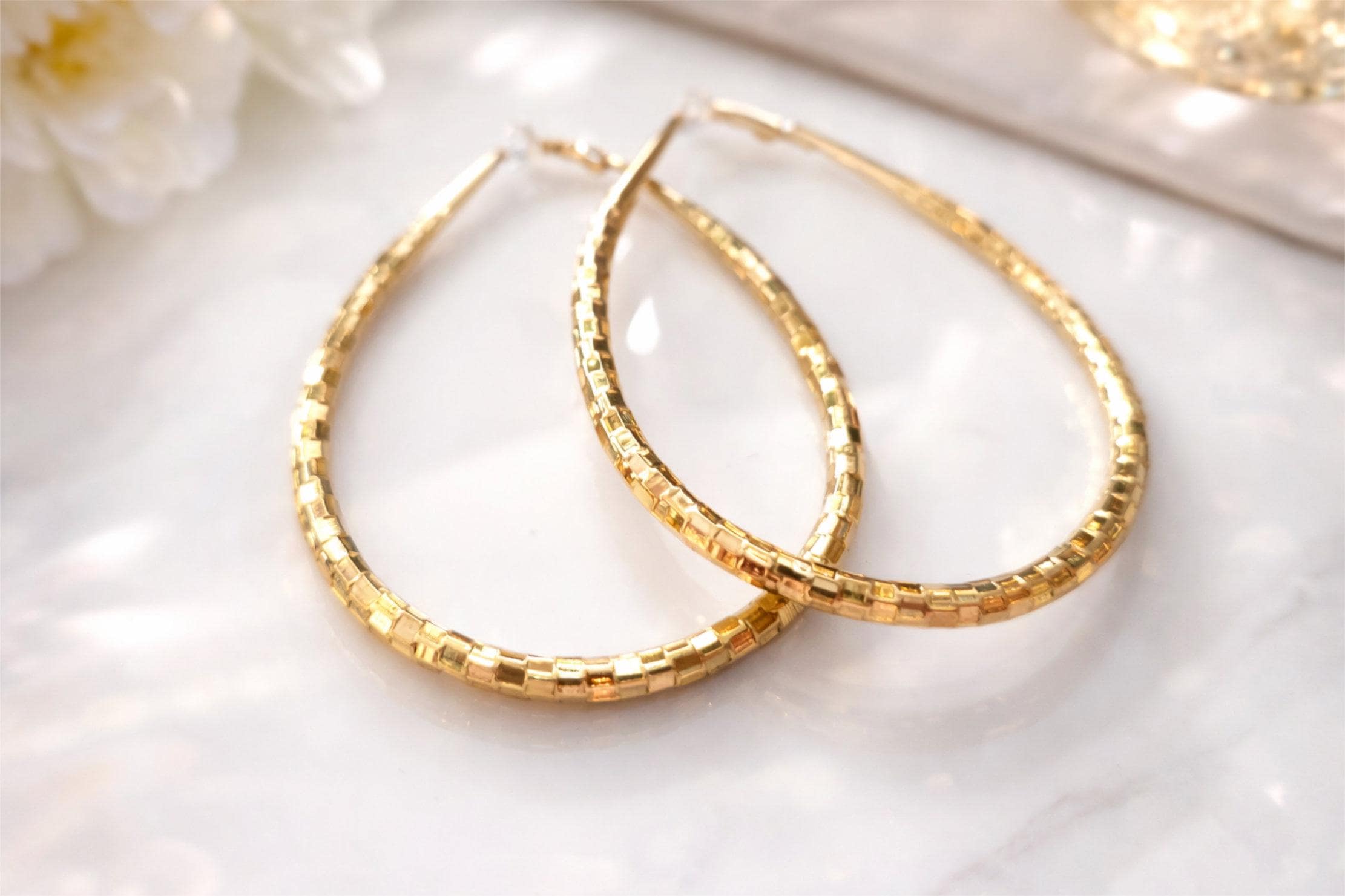 Add bold elegance with these stunning textured teardrop hoop clip-on earrings, designed to catch the light from every angle. The beautifully faceted square pattern creates a shimmering mosaic effect across the gold surface, giving these hoops a high-end, eye-catching finish without the weight.