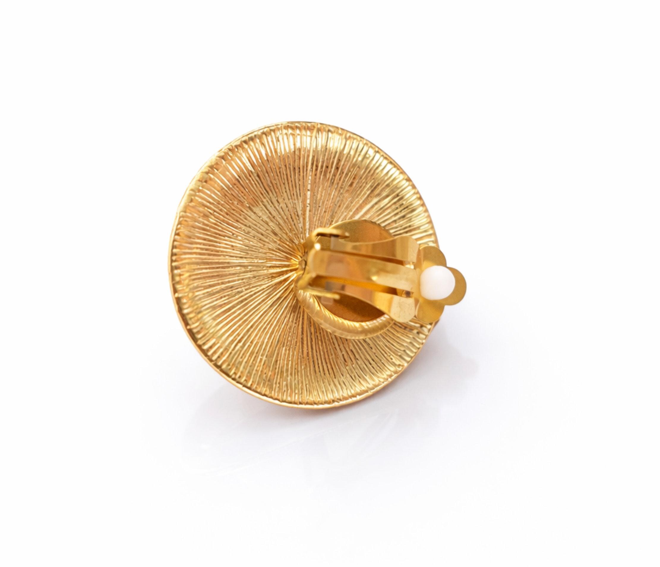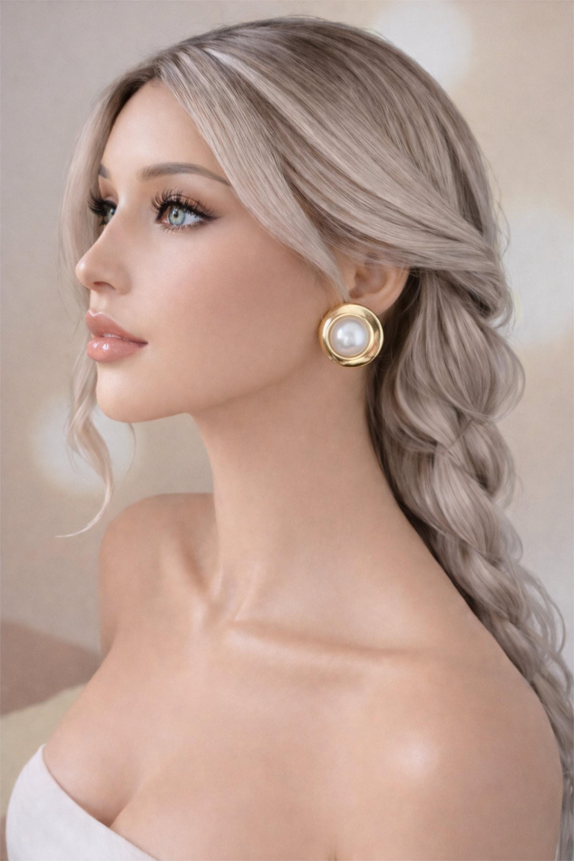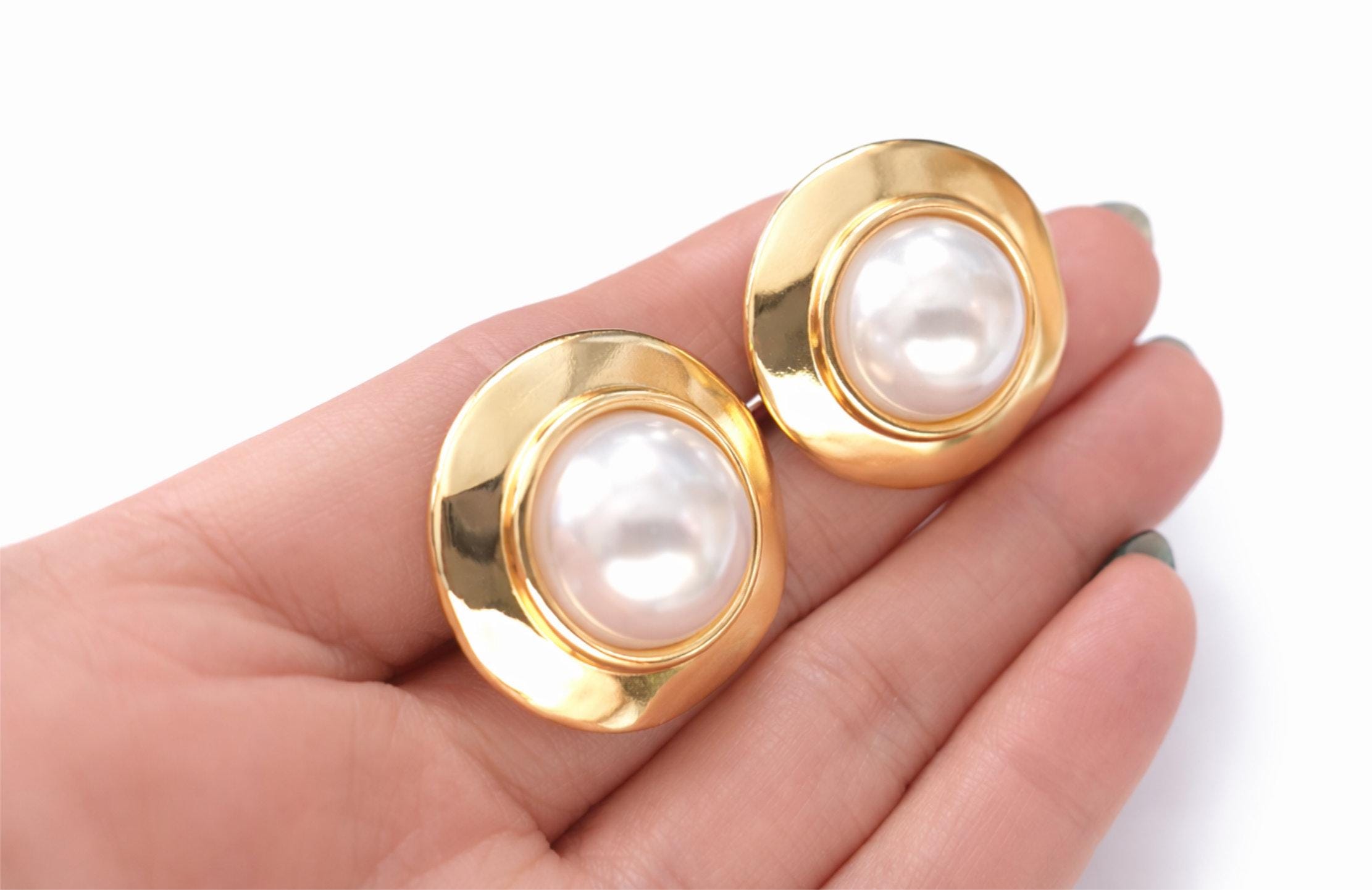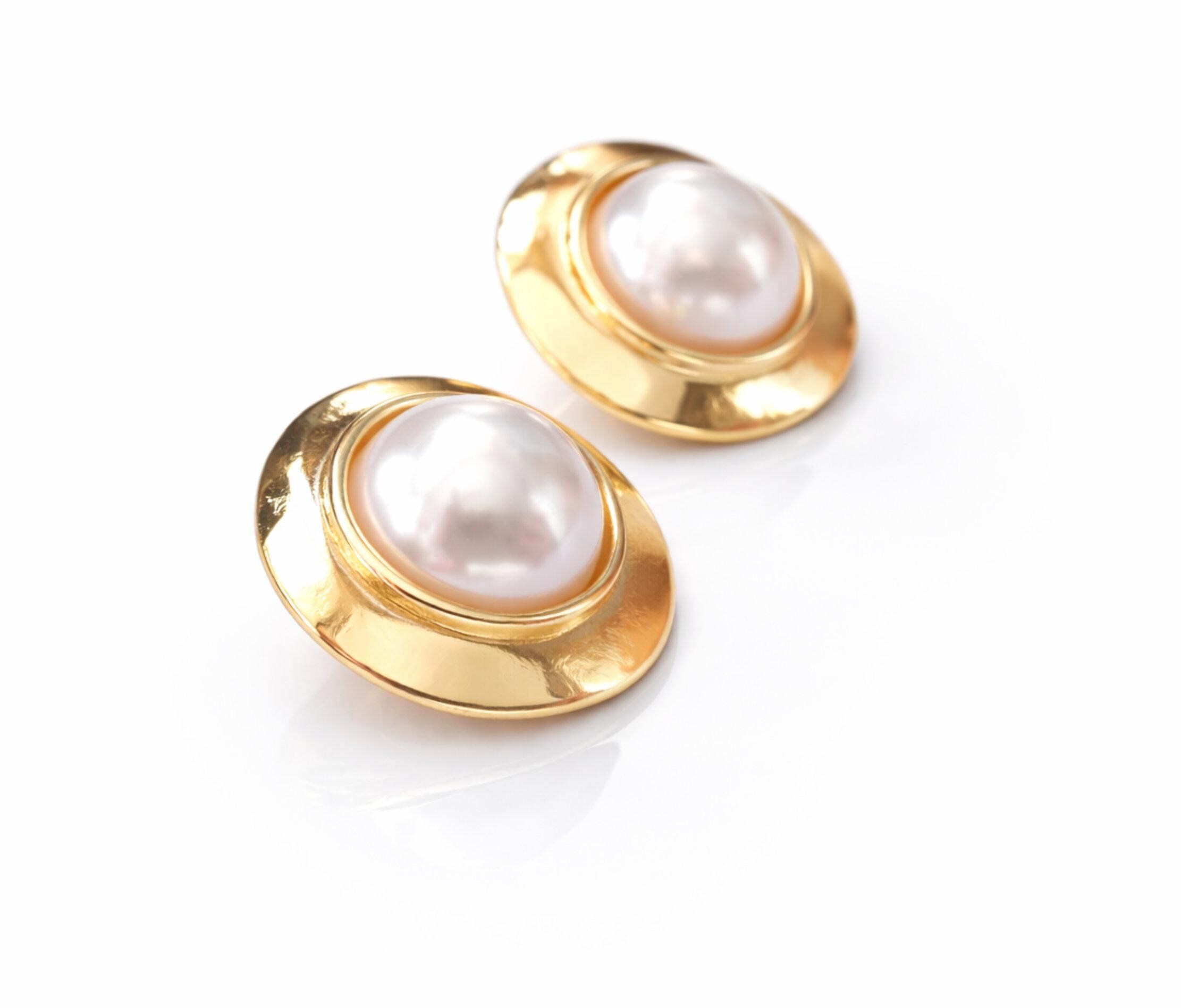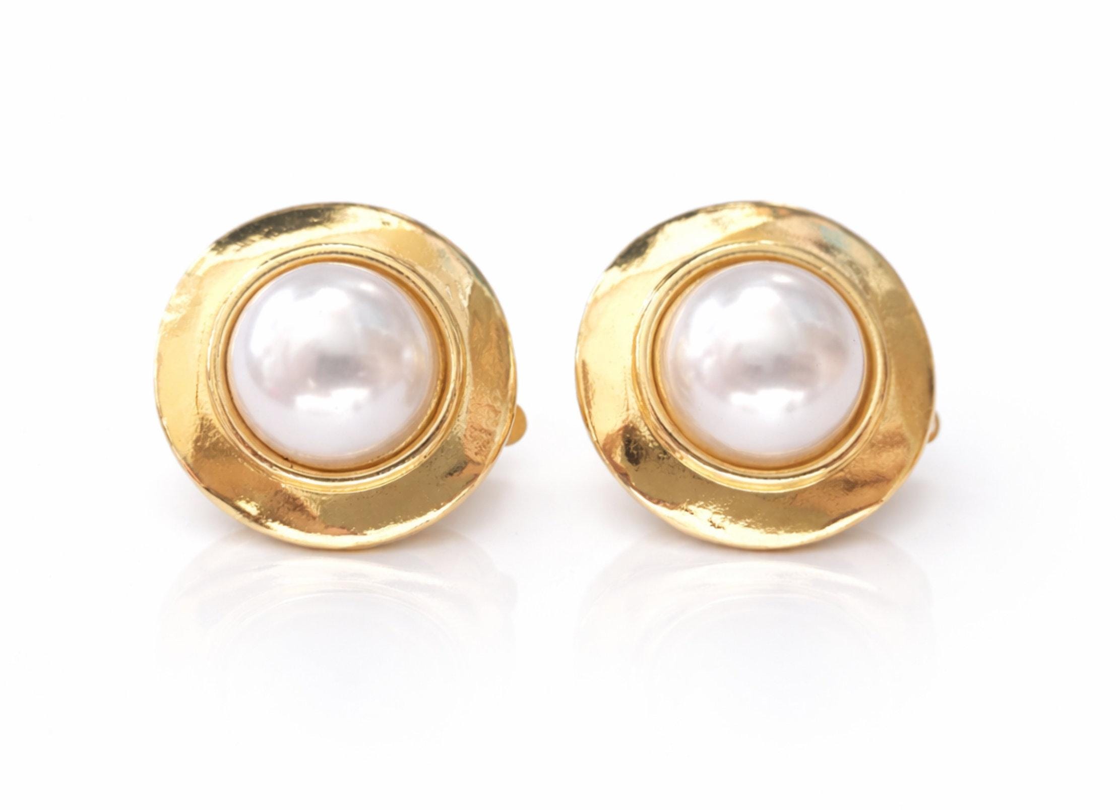 These vintage-inspired gold and pearl clip on earrings feature a luminous domed pearl set into a softly hammered, high-shine gold surround. The organic shape of the gold frame gives them a statement look while keeping the overall style classic and wearable.