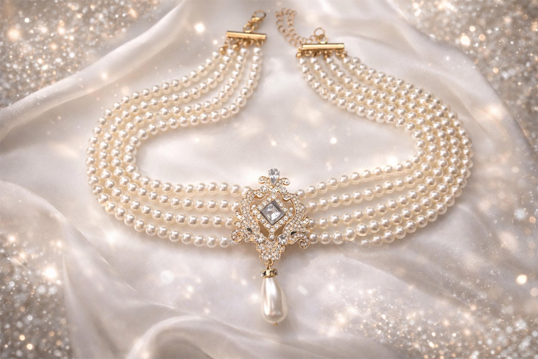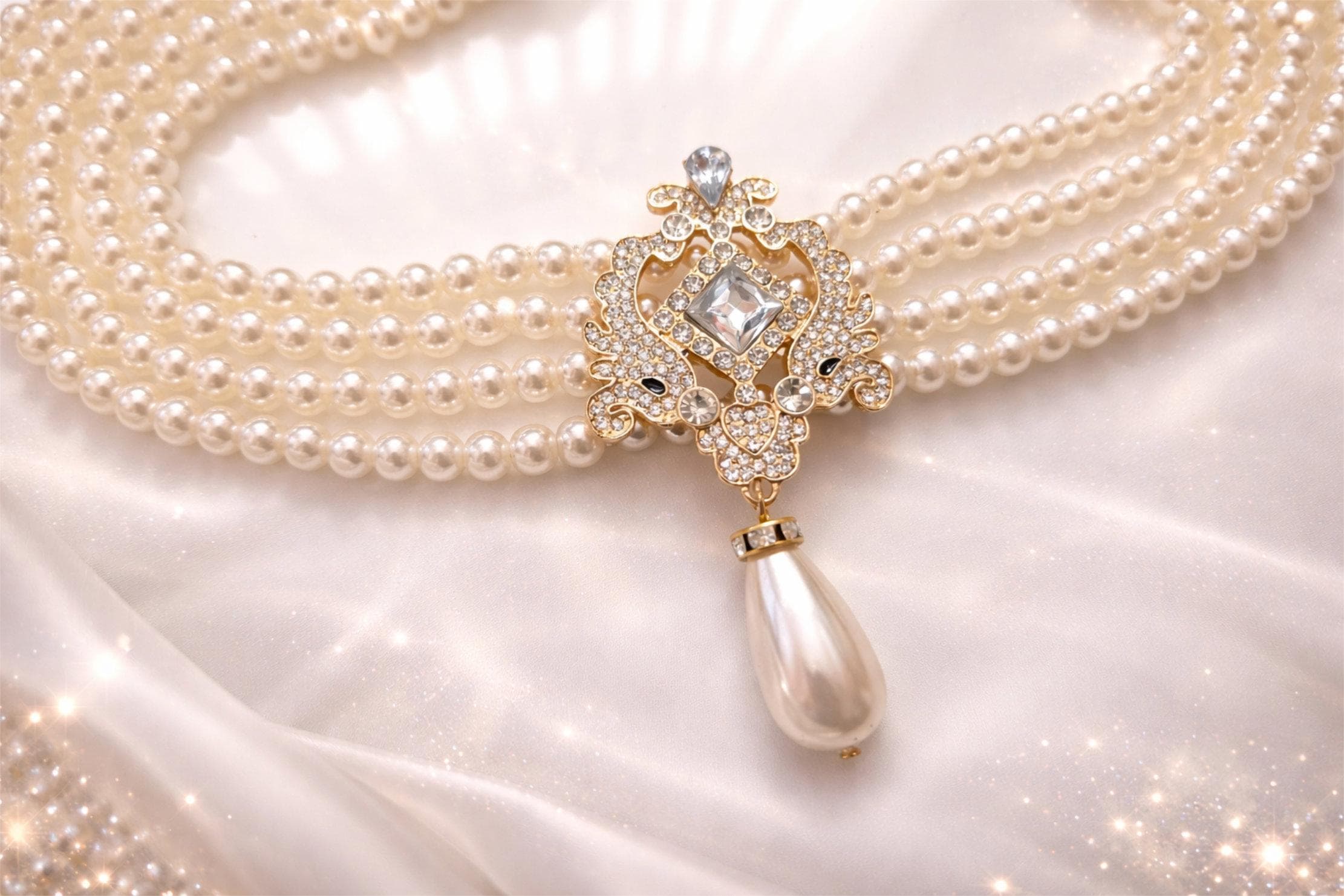 Make a statement with this elegant multi-strand faux pearl choker necklace, designed for brides and lovers of timeless vintage glamour.
