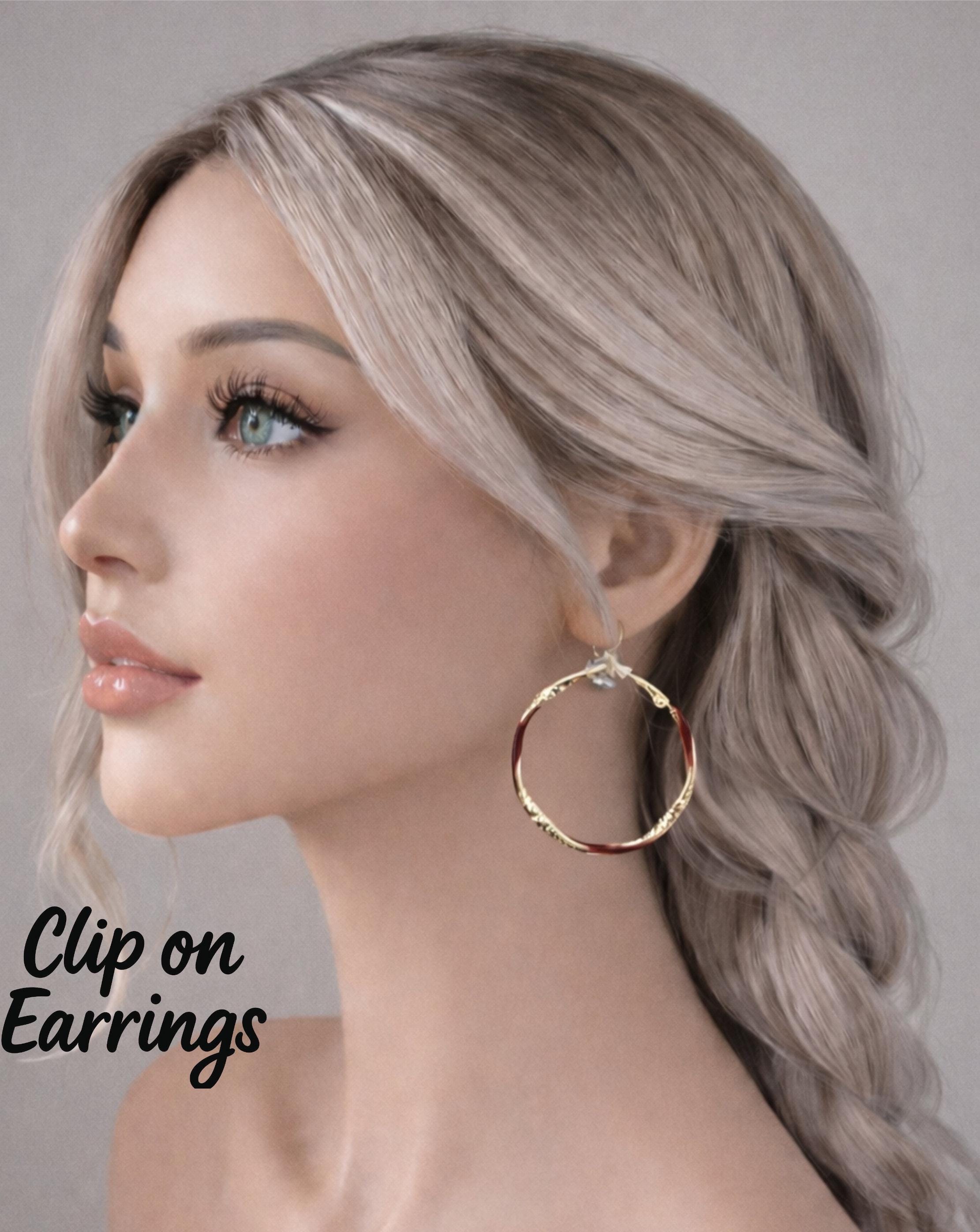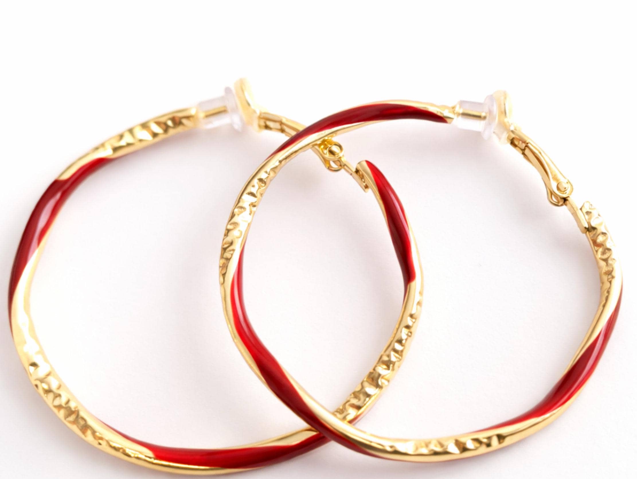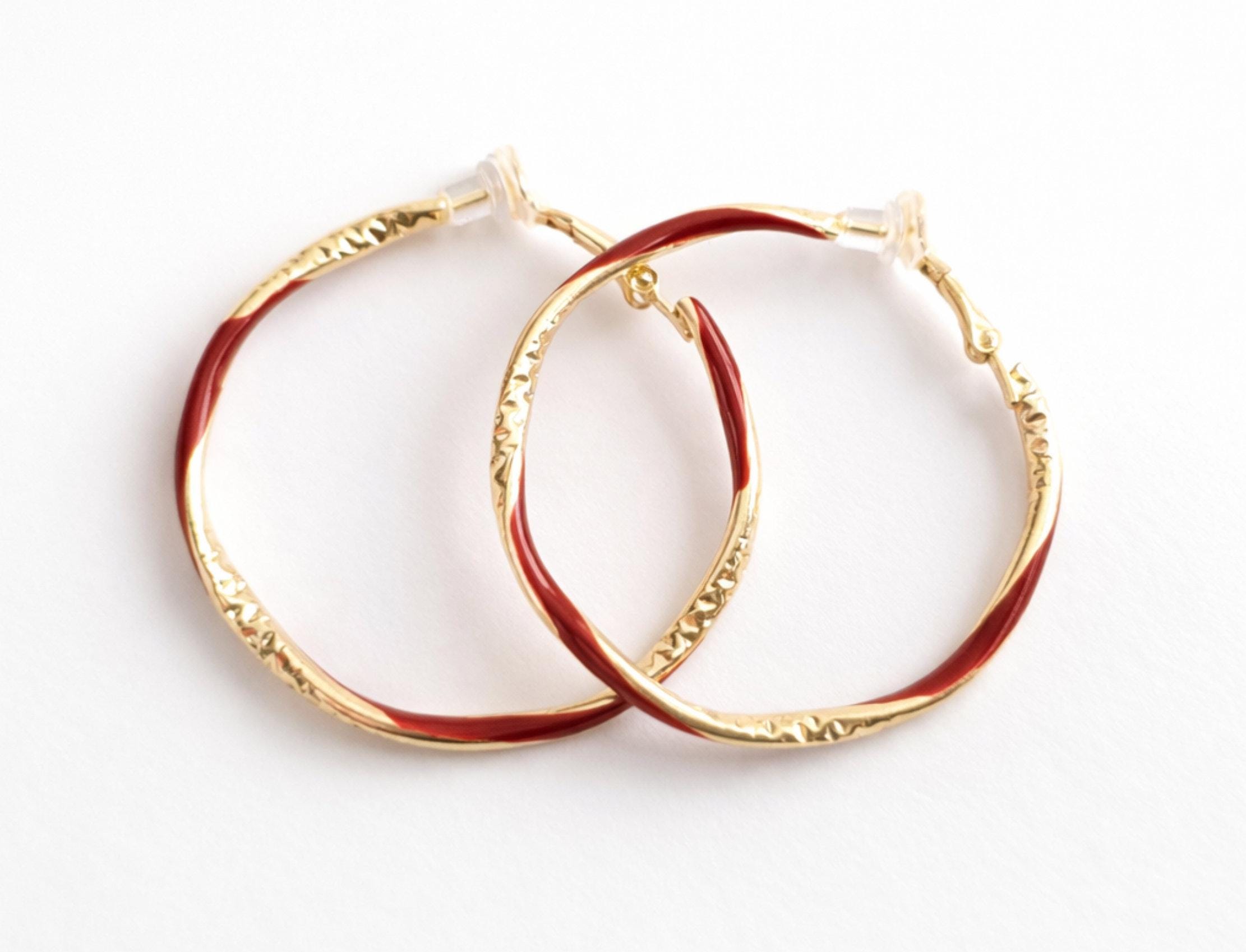 Make a statement with these striking red and gold twisted hoop earrings. Featuring a textured gold tone finish intertwined with glossy red enamel, these hoops are bold, elegant, and designed to stand out.