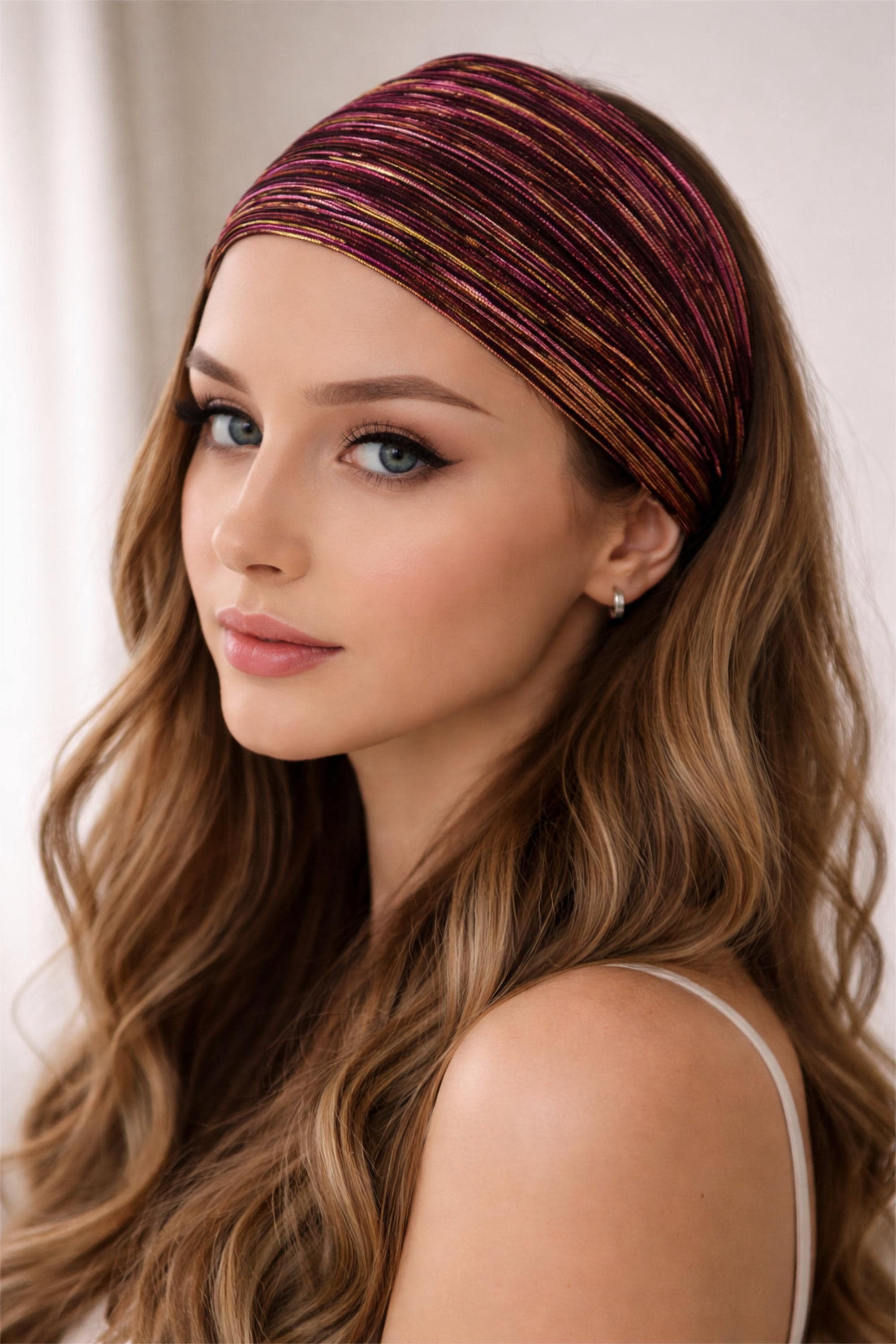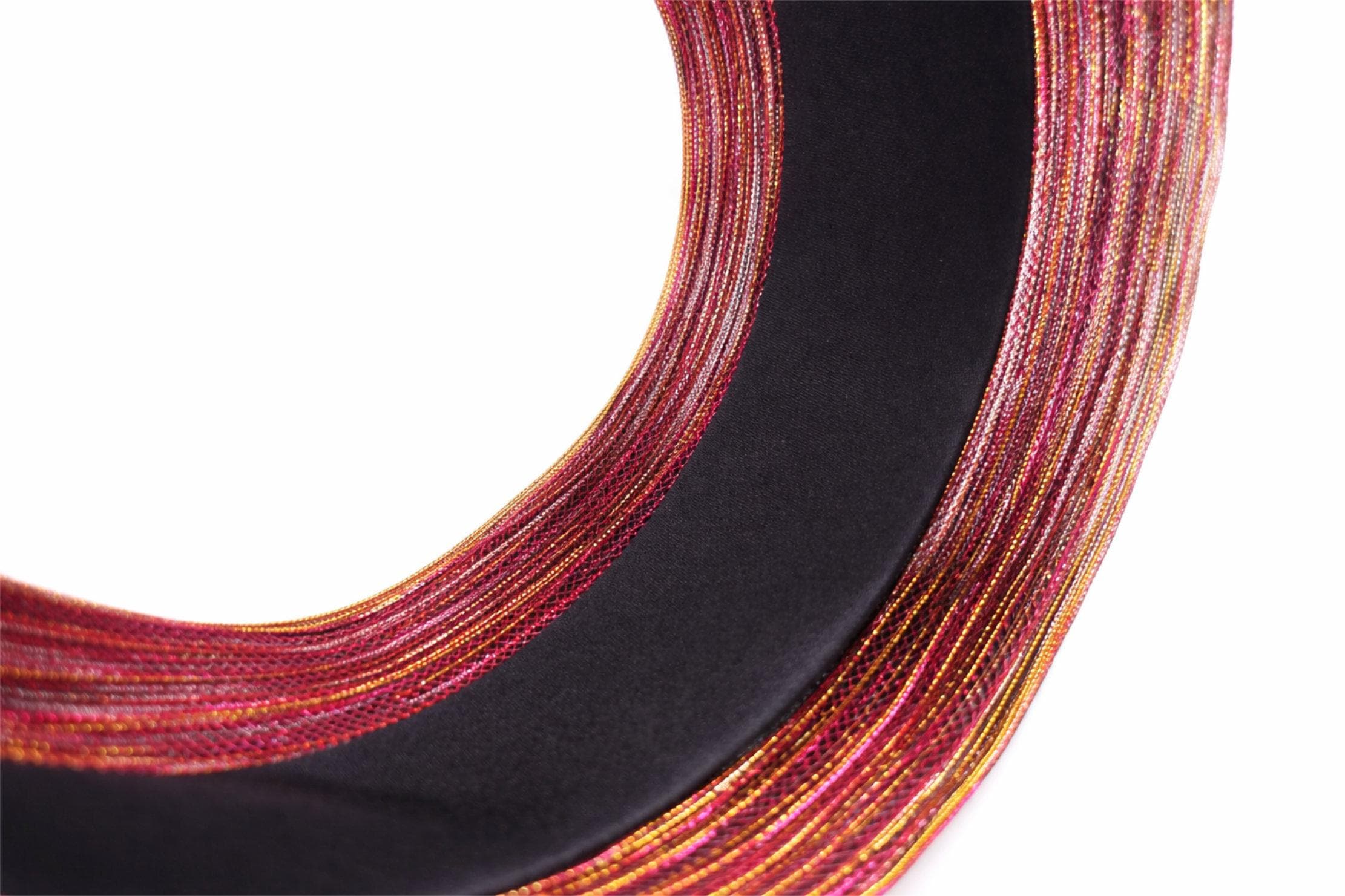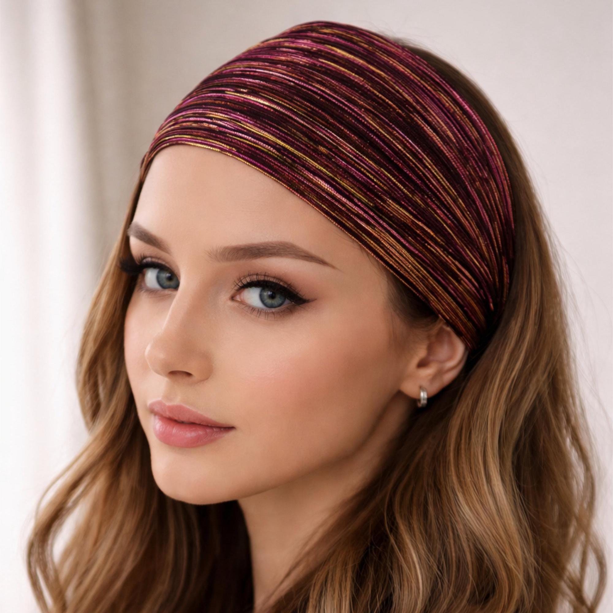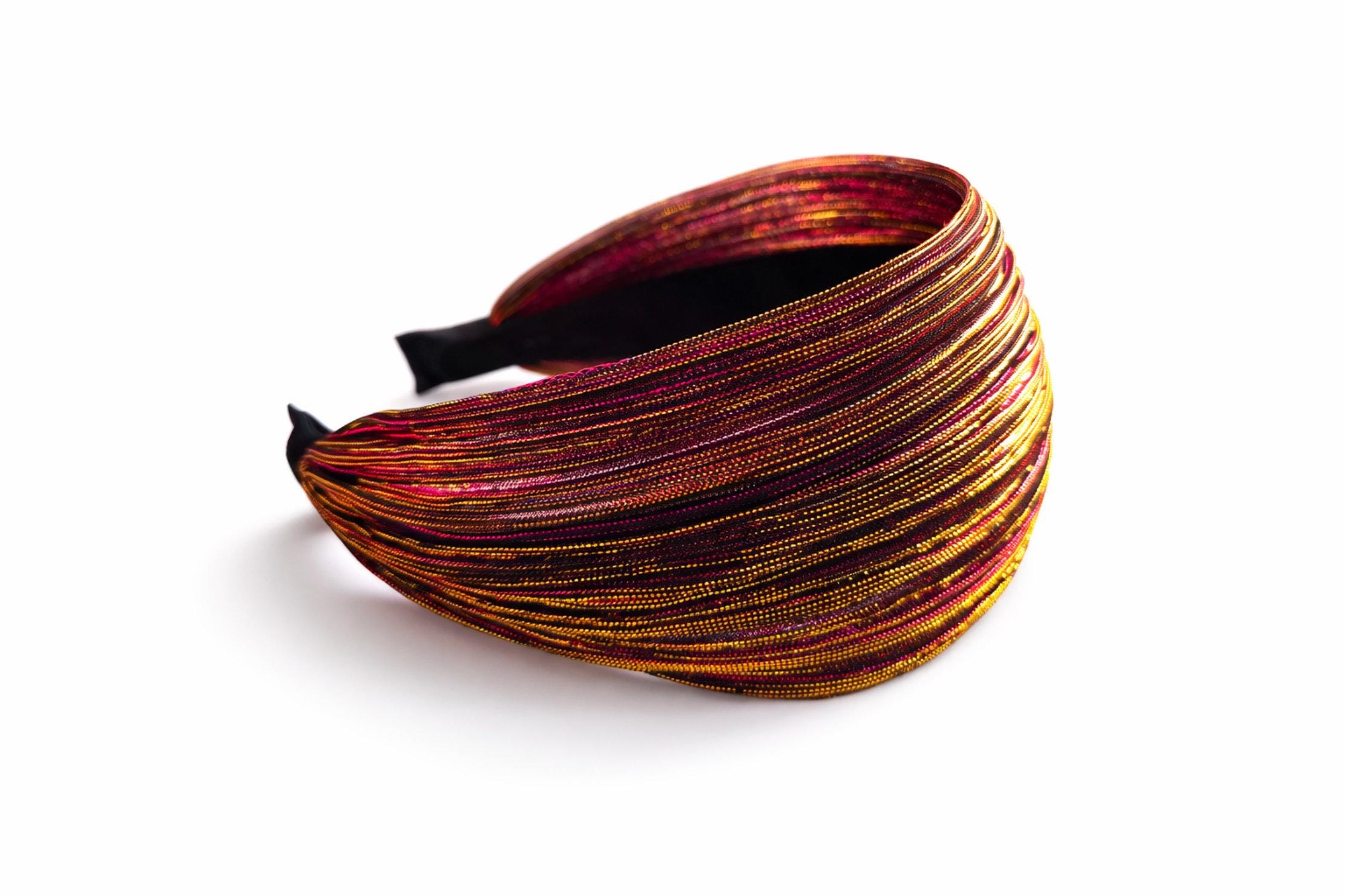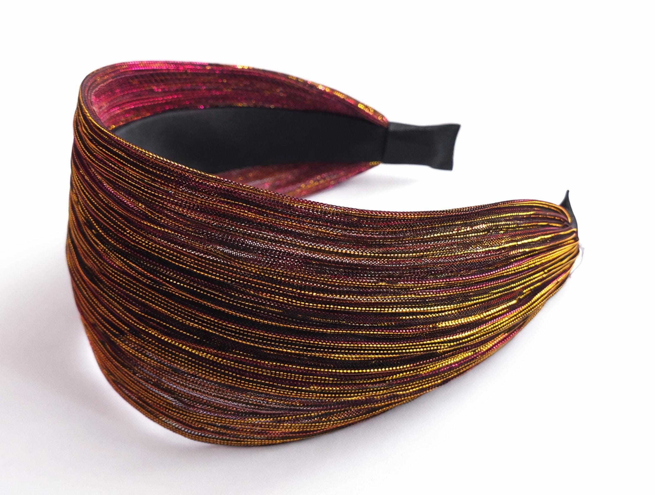 Make a bold statement with this stunning wide padded headband, woven with shimmering metallic threads in vibrant pink and warm gold tones.