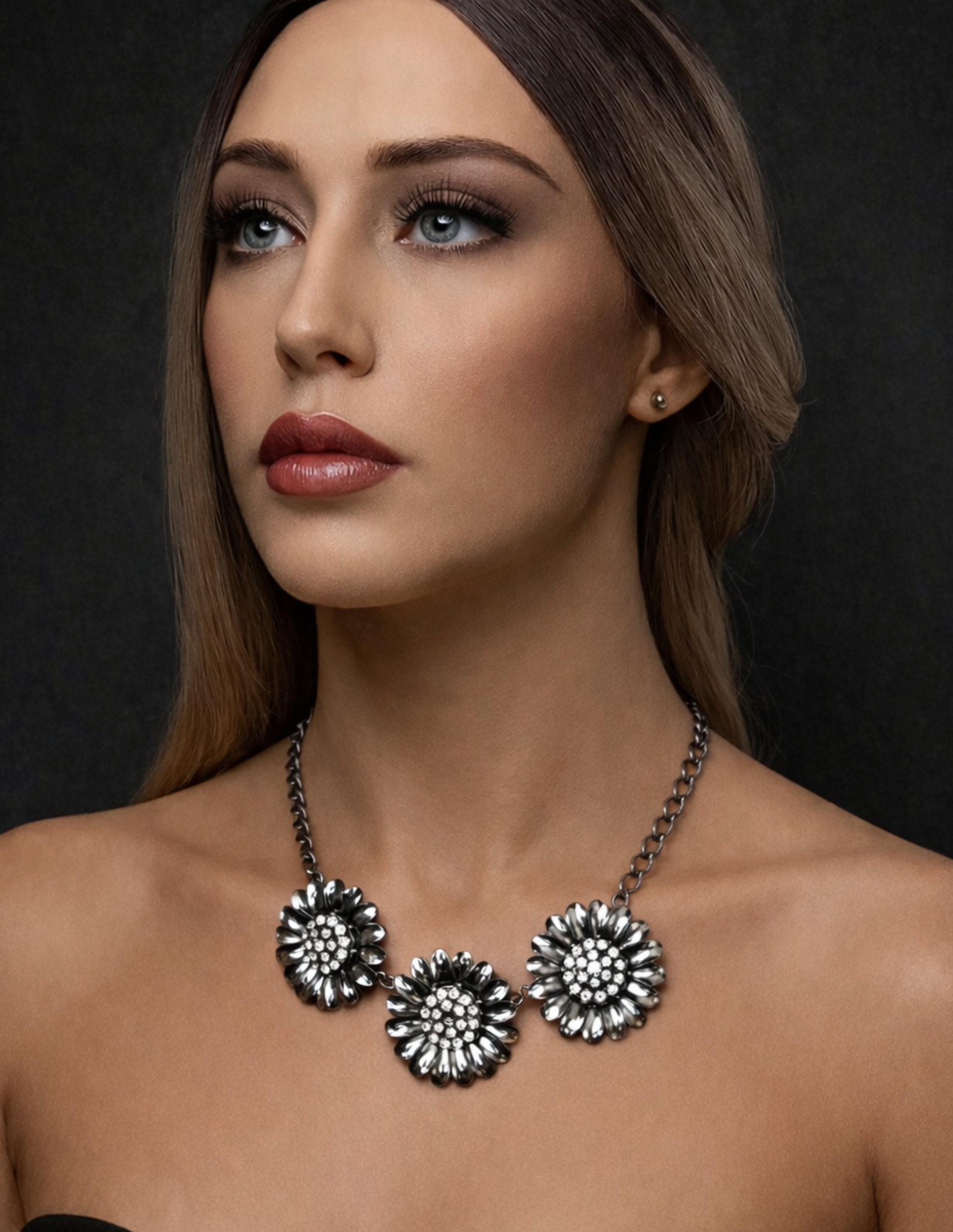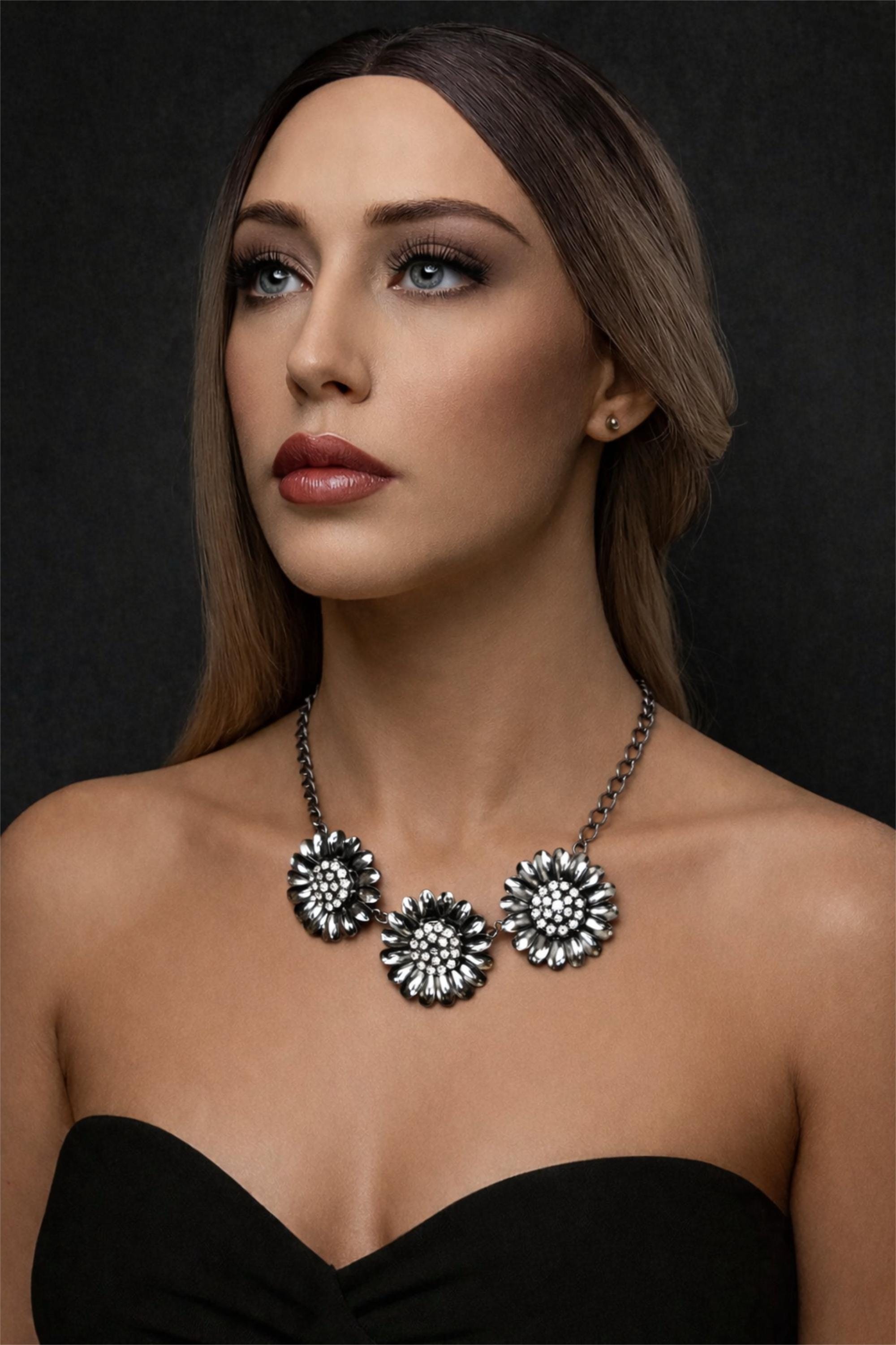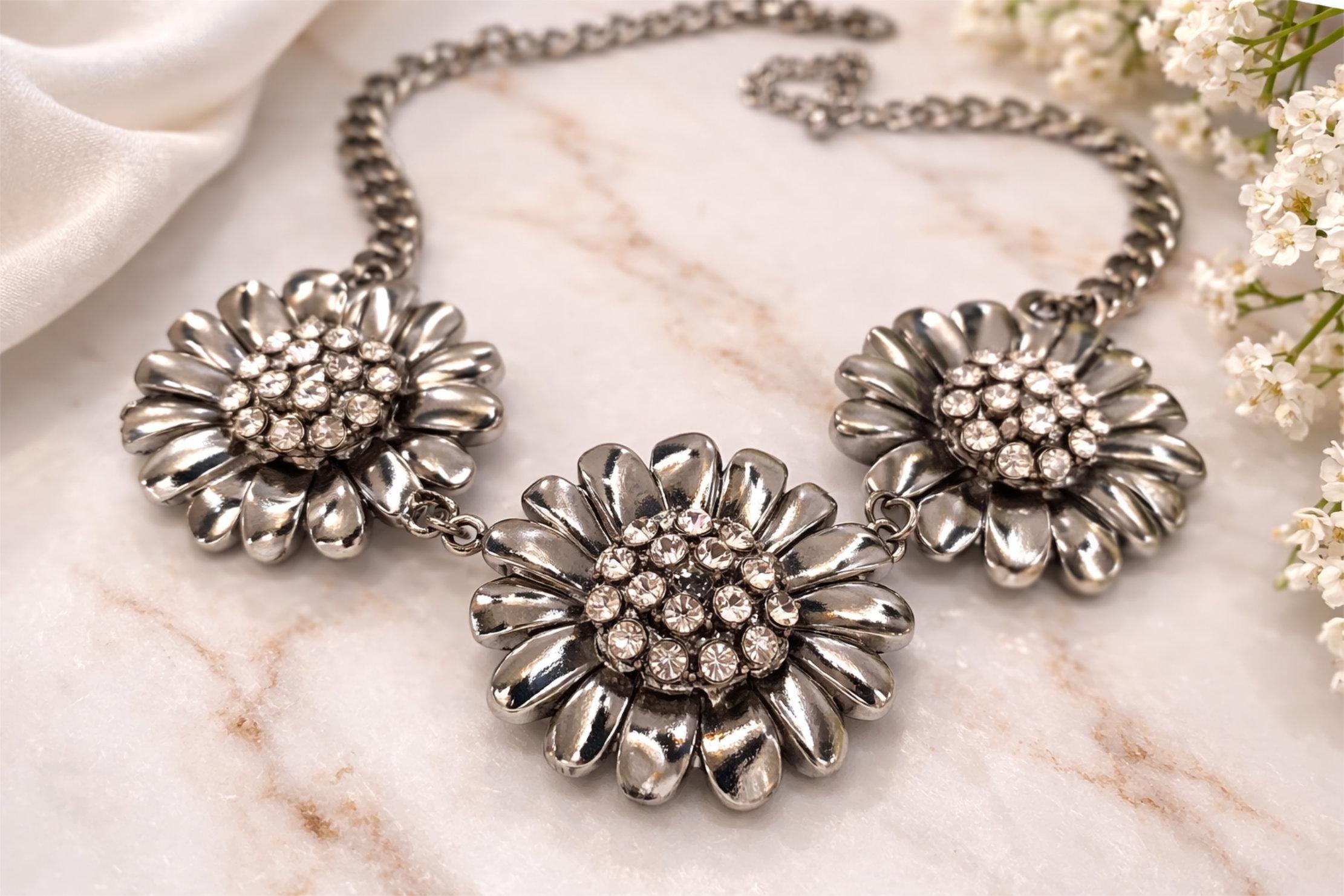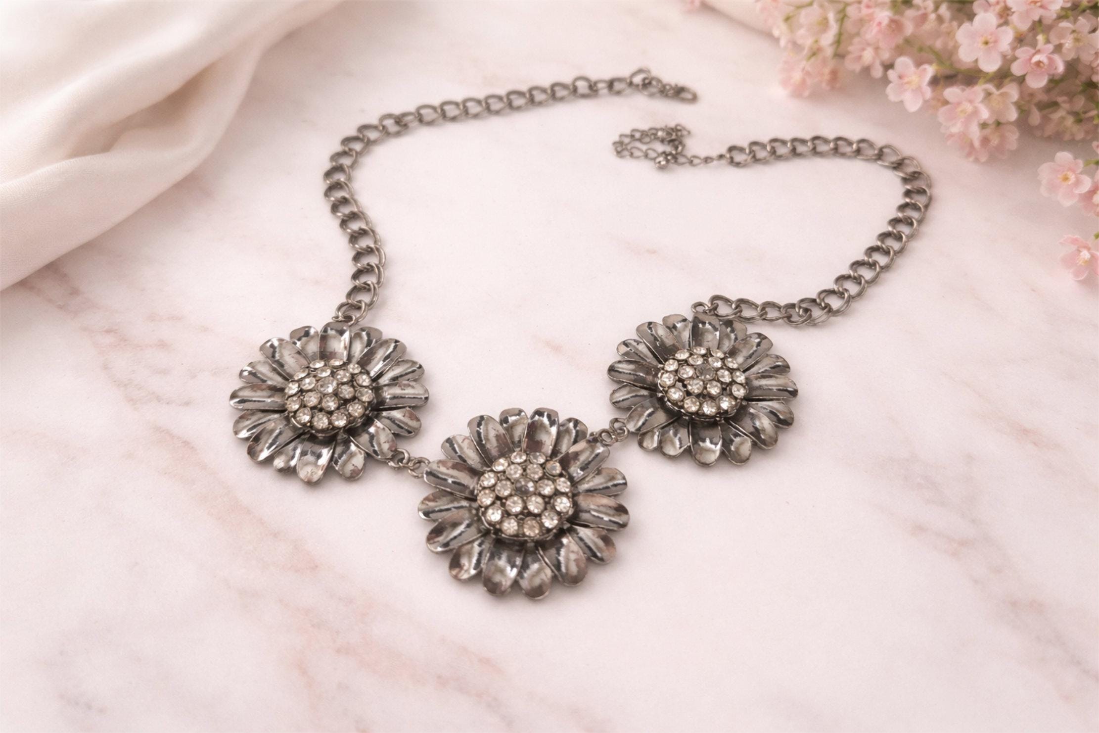 Beautiful gunmetal tone flower statement necklace featuring three detailed daisy style flowers with sparkling crystal centres.