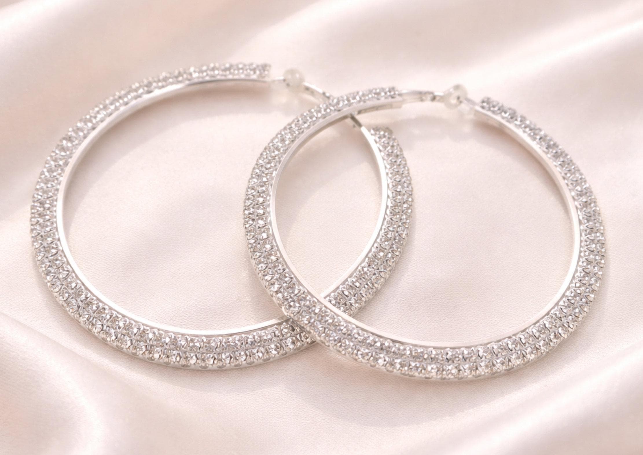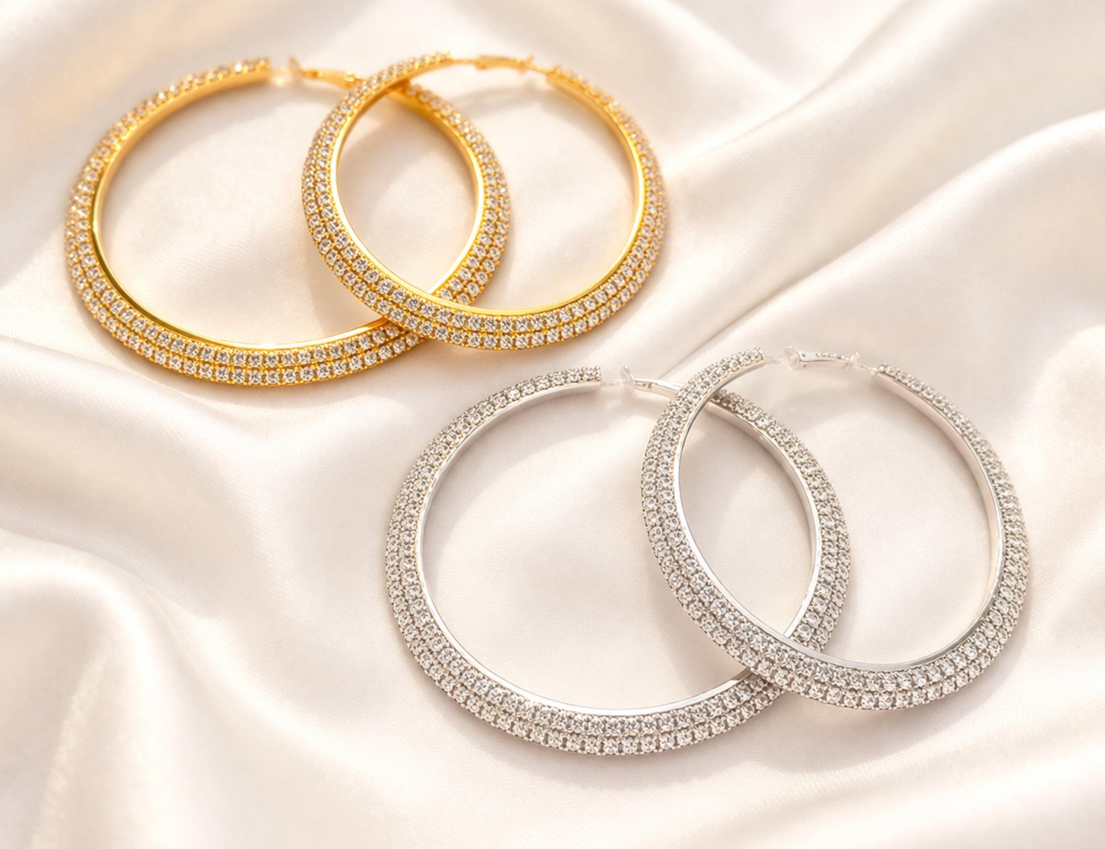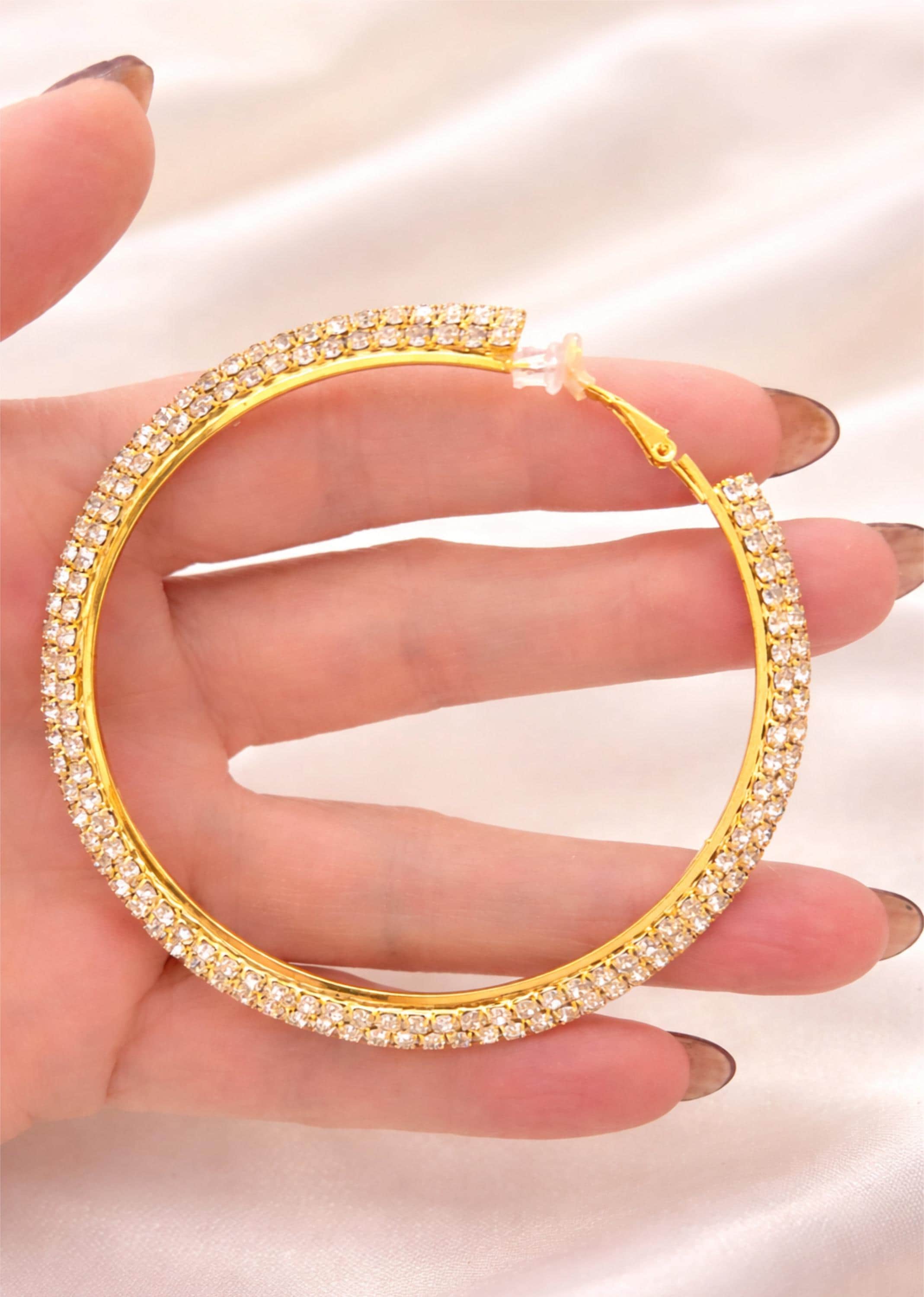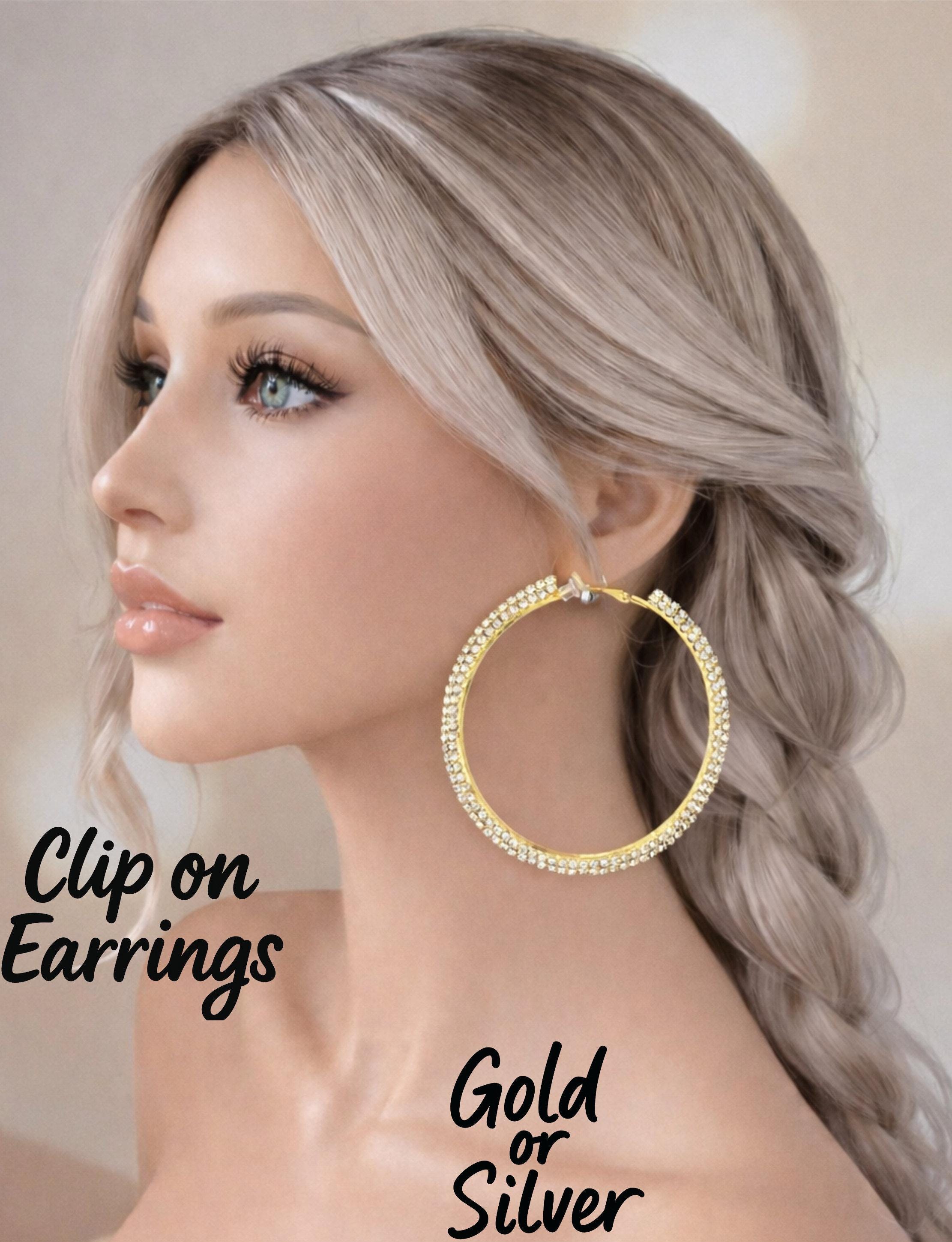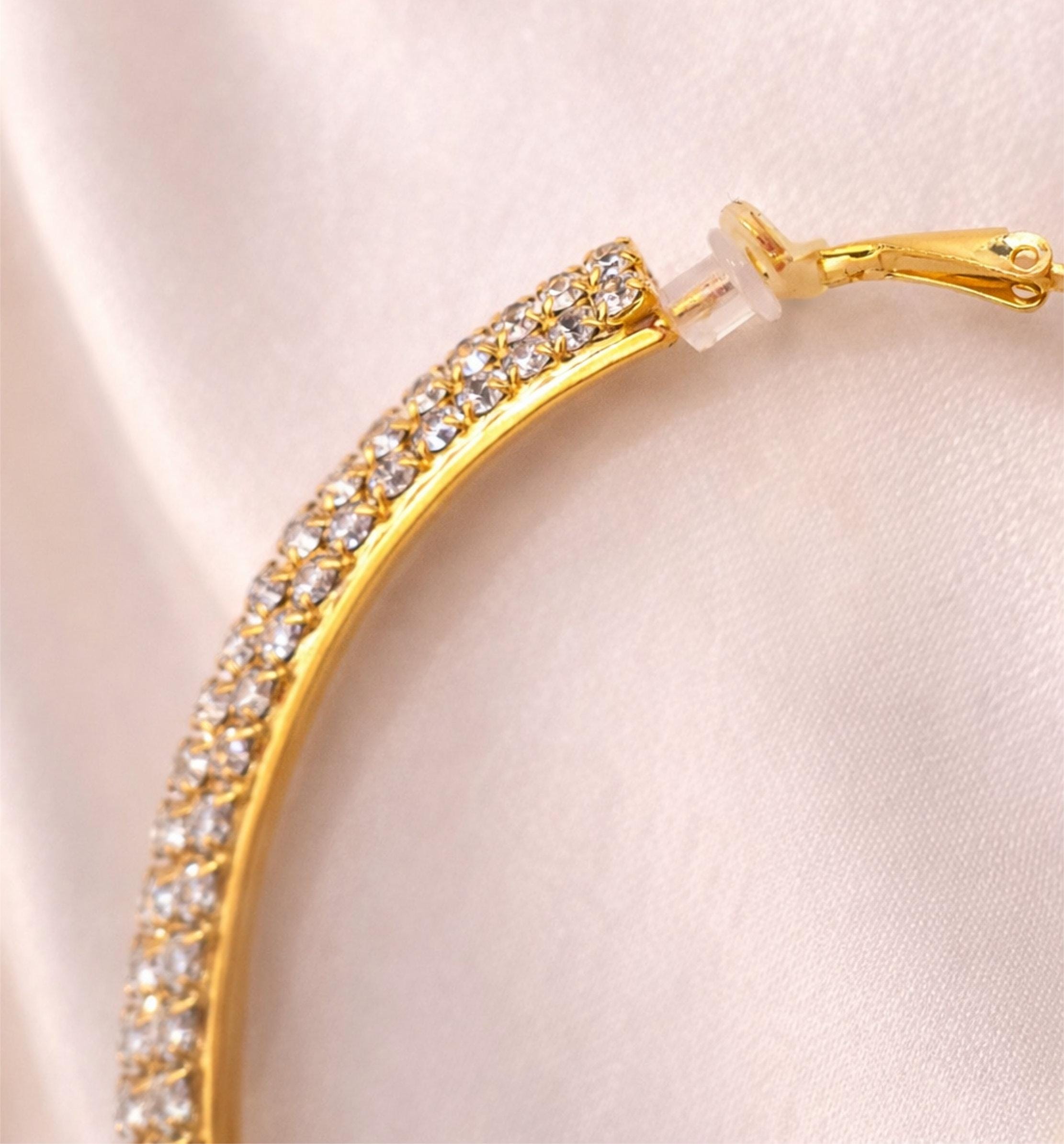 Large statement clip-on hoop earrings available in gold tone or silver tone, finished with sparkling outward facing rhinestone detailing for a bold yet elegant look.
