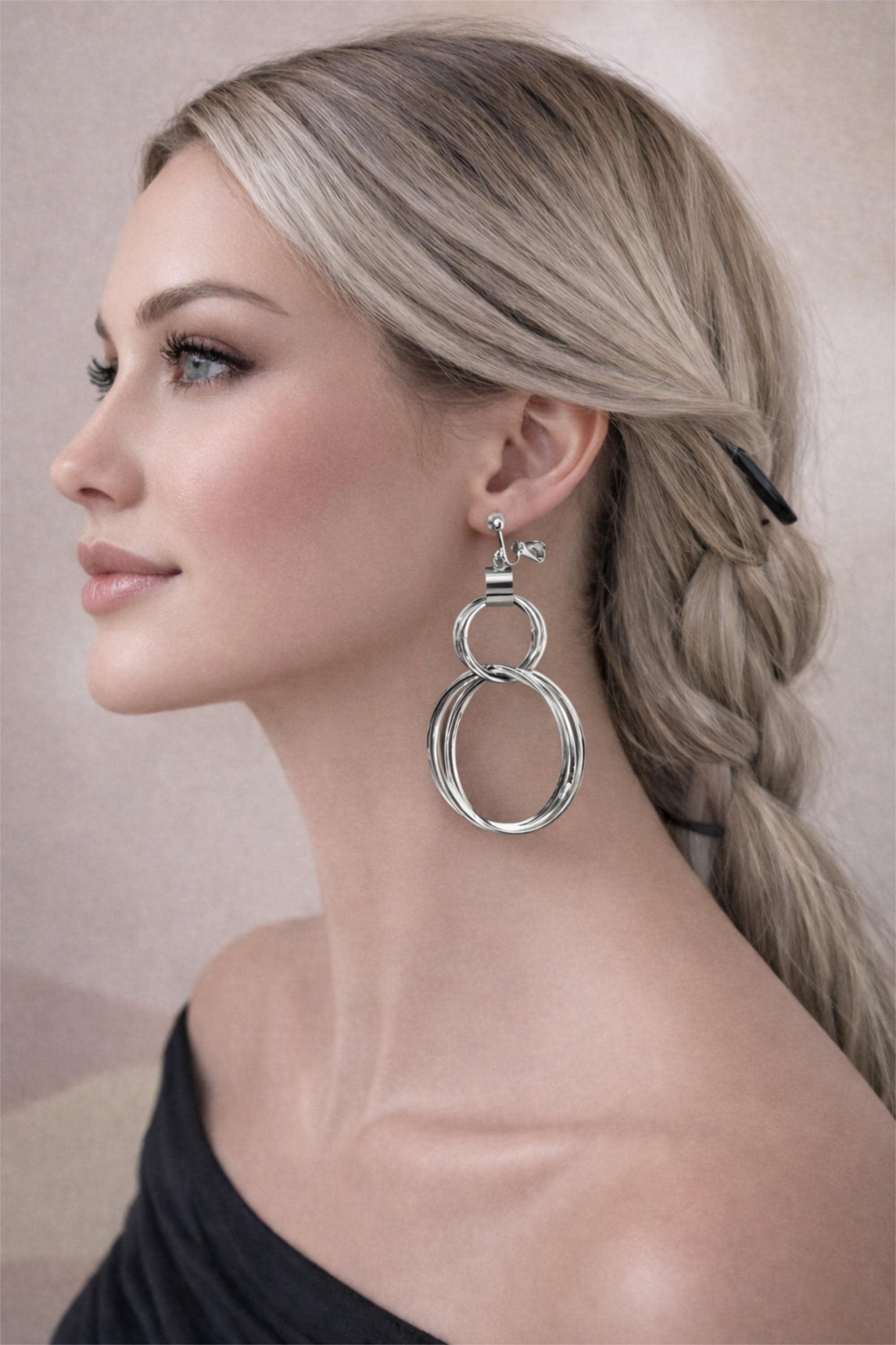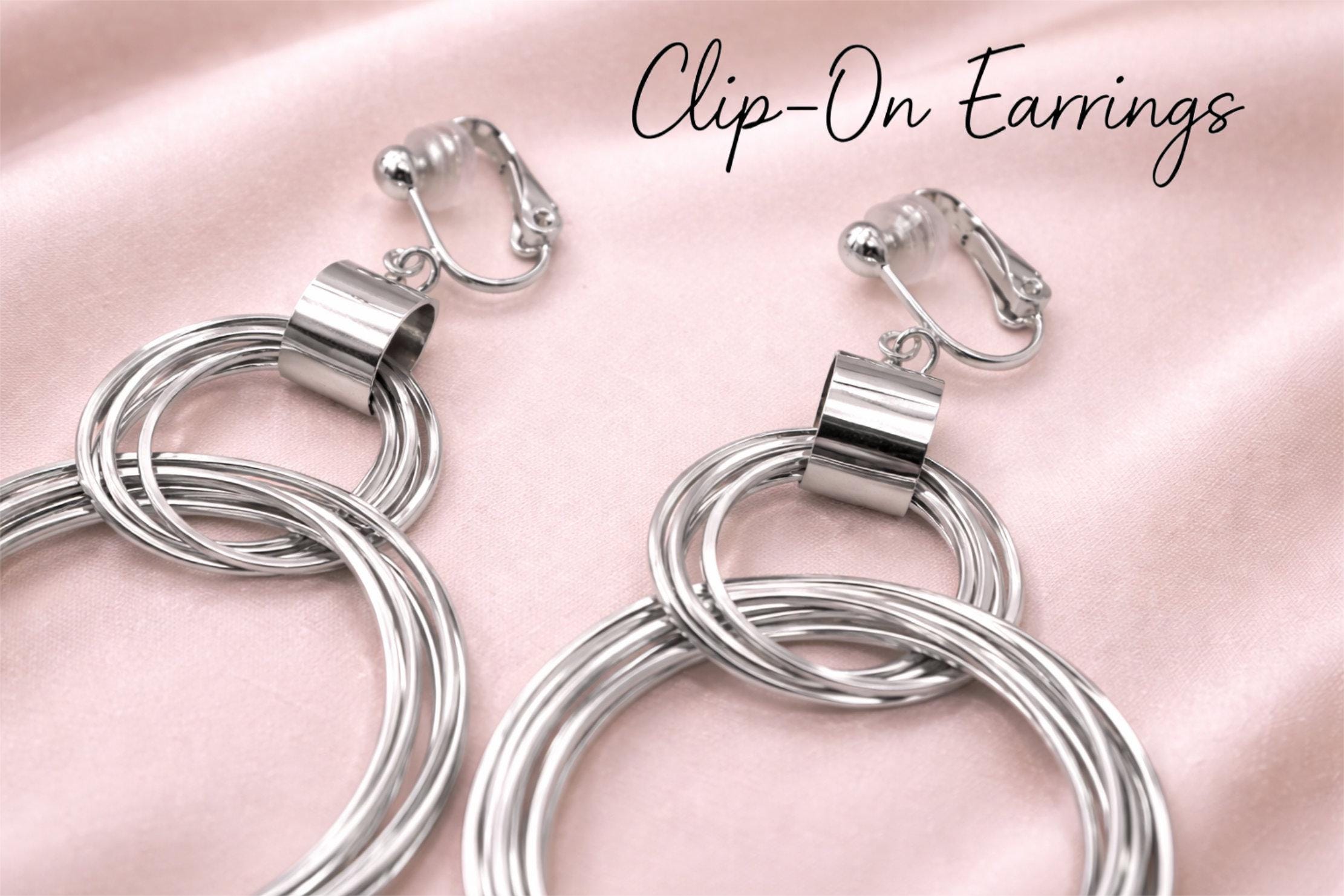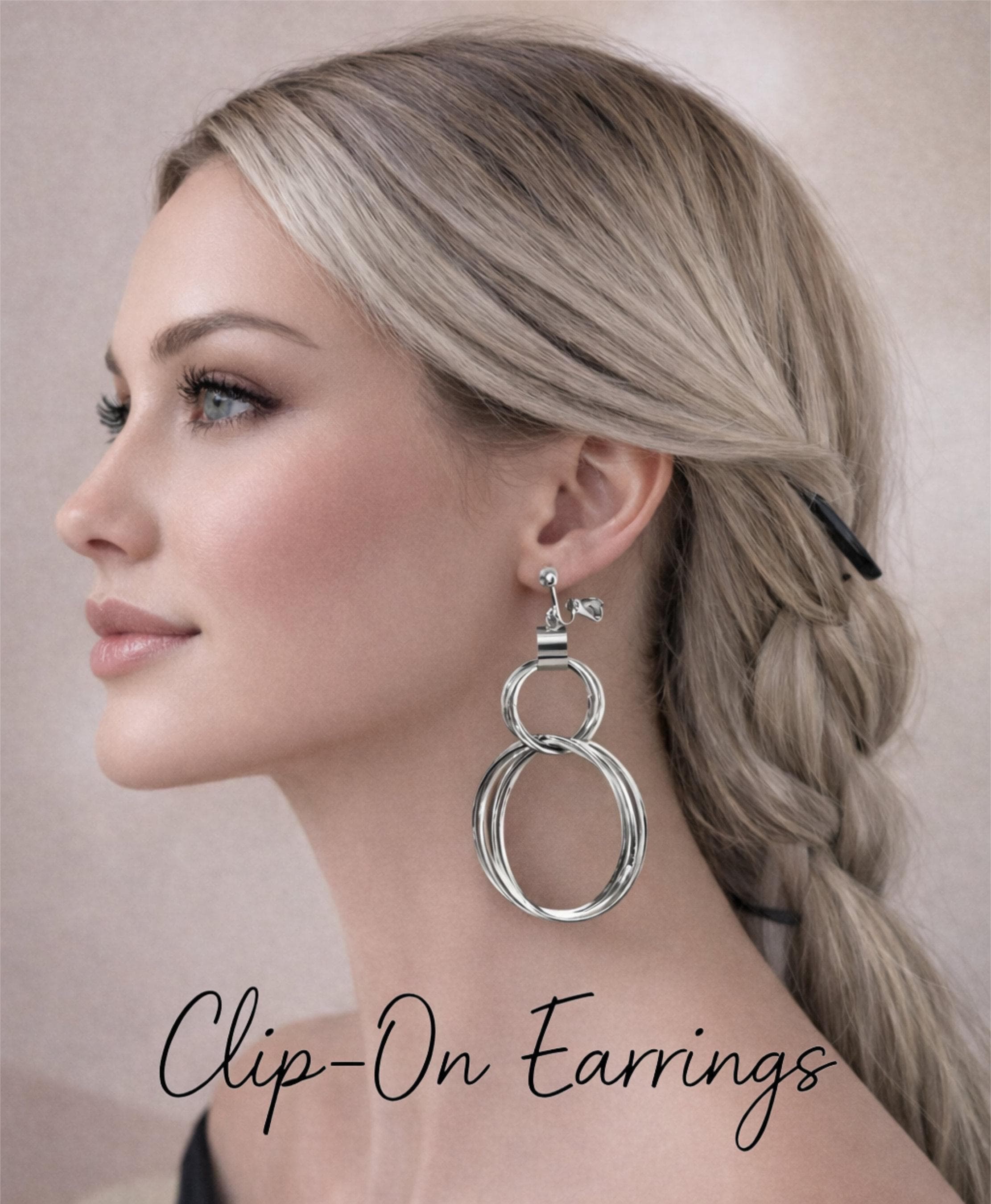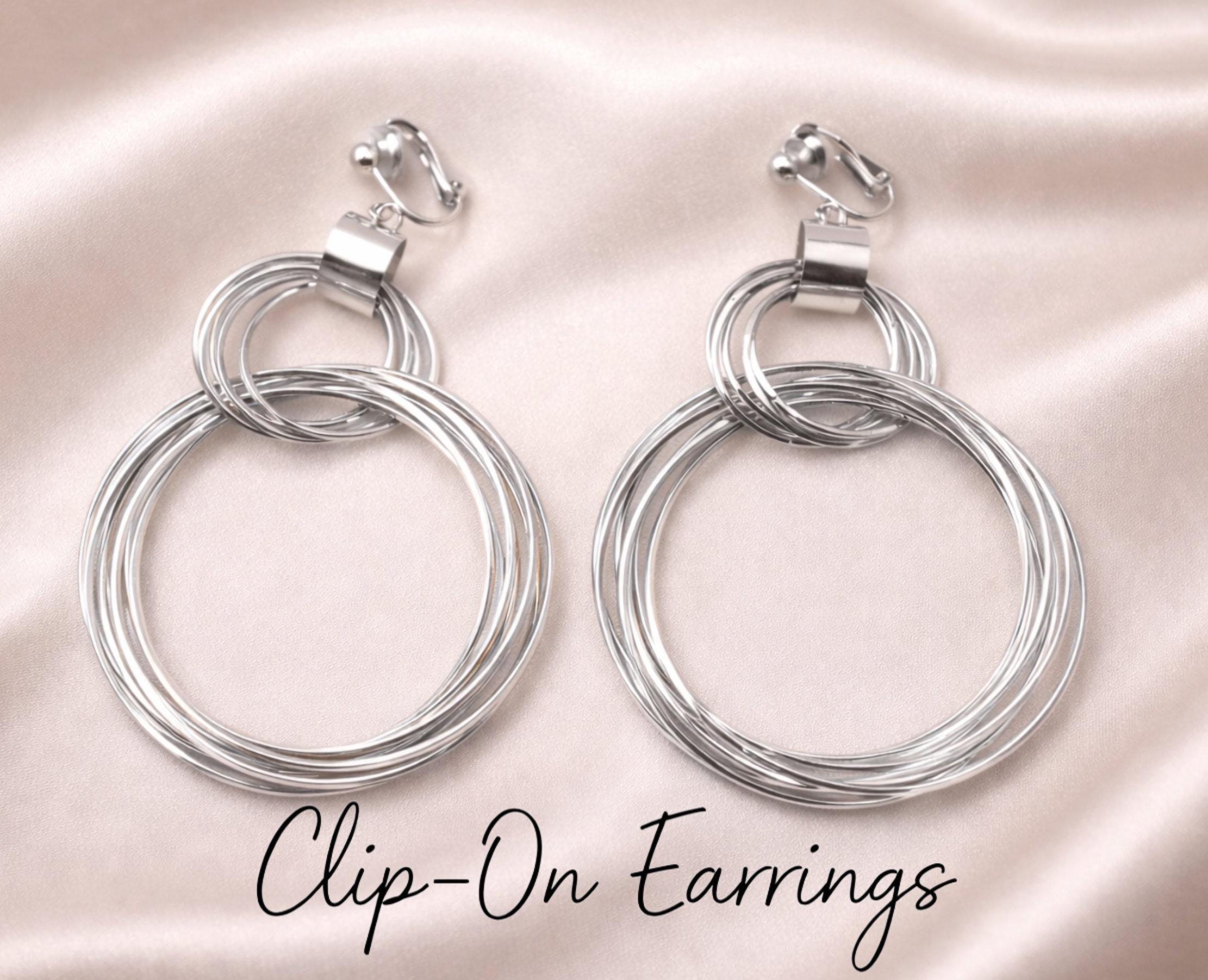 Bold yet elegant, these silver tone earrings feature layered hoop rings for a striking statement look. Designed for comfort without pierced ears, the lightweight construction makes them easy to wear all day or night.
