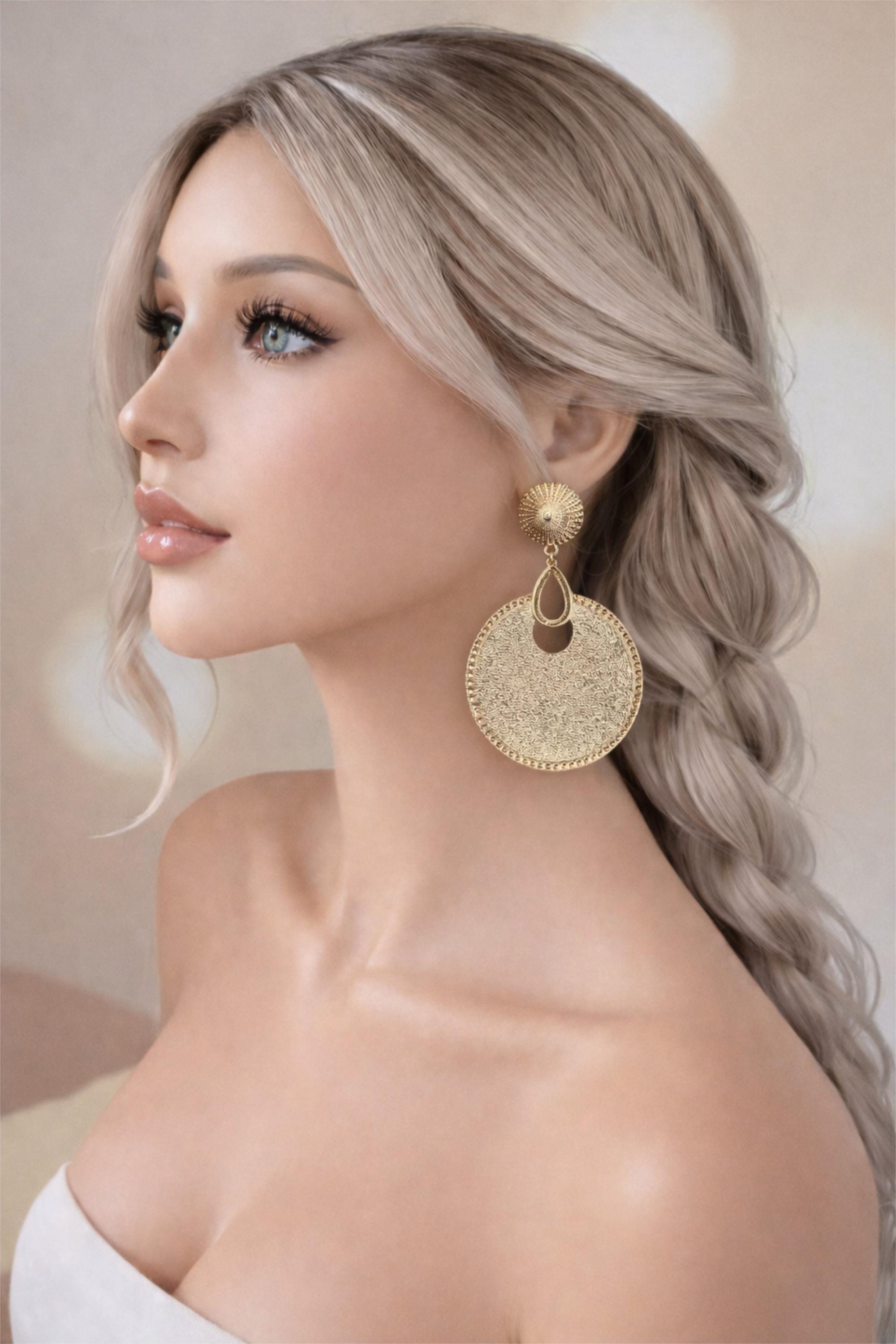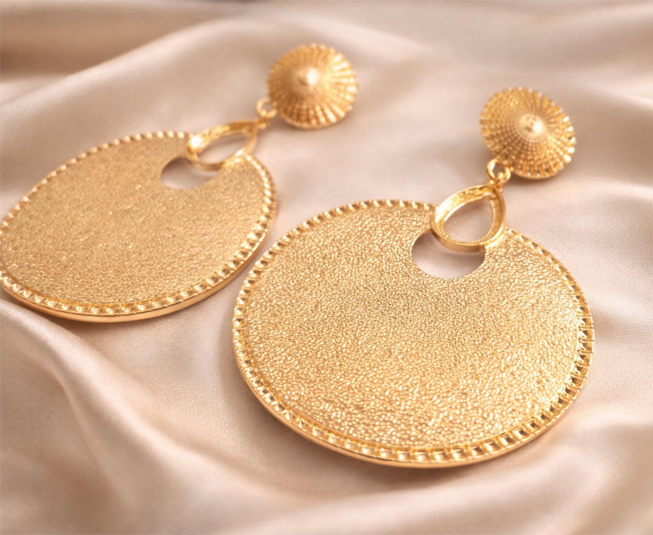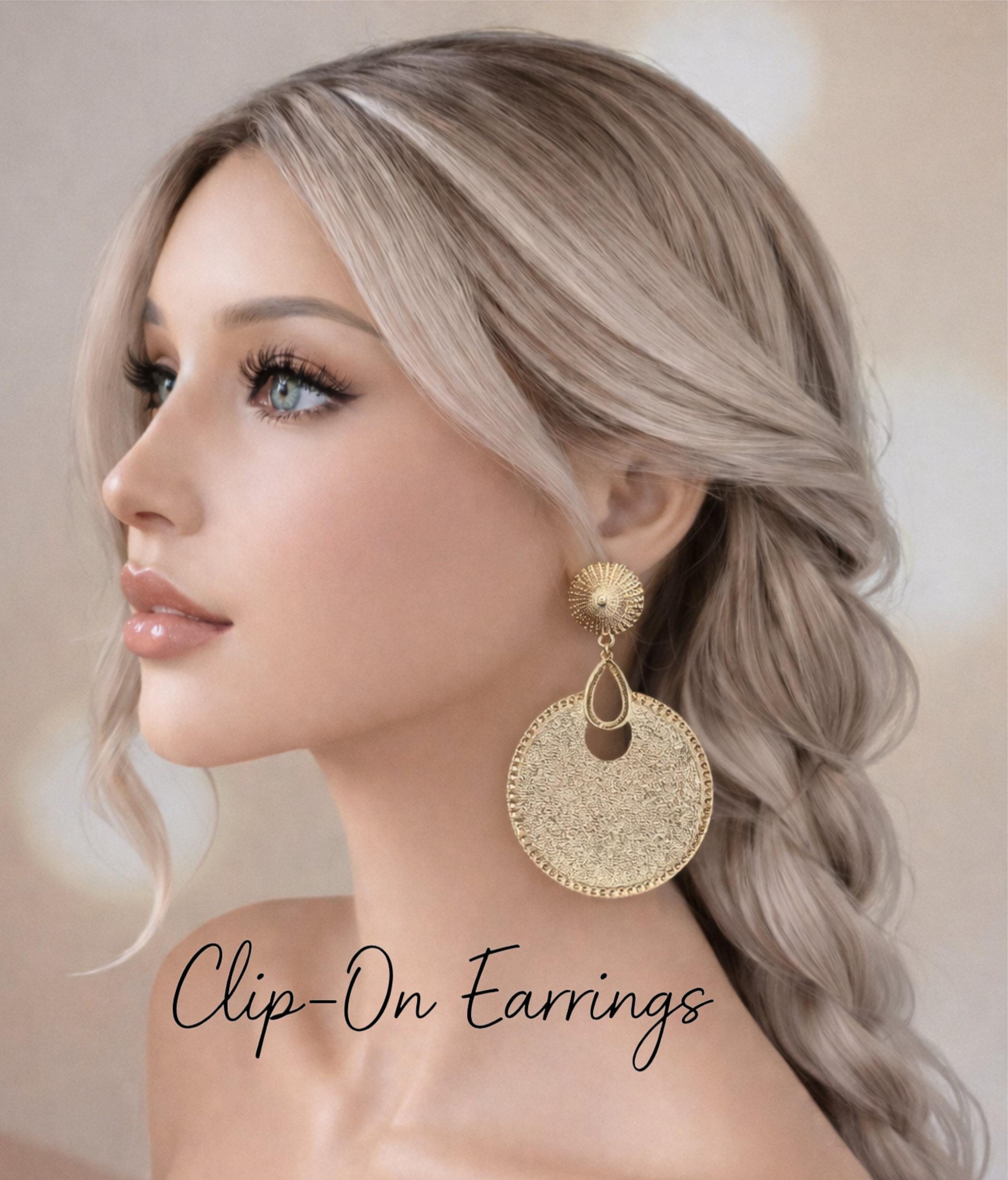 Make a bold statement with these oversized gold tone clip-on earrings, designed with a beautifully textured disc and detailed edging for a luxe, eye-catching finish. Perfect for adding instant glamour to any outfit—whether it’s everyday styling or special occasions.