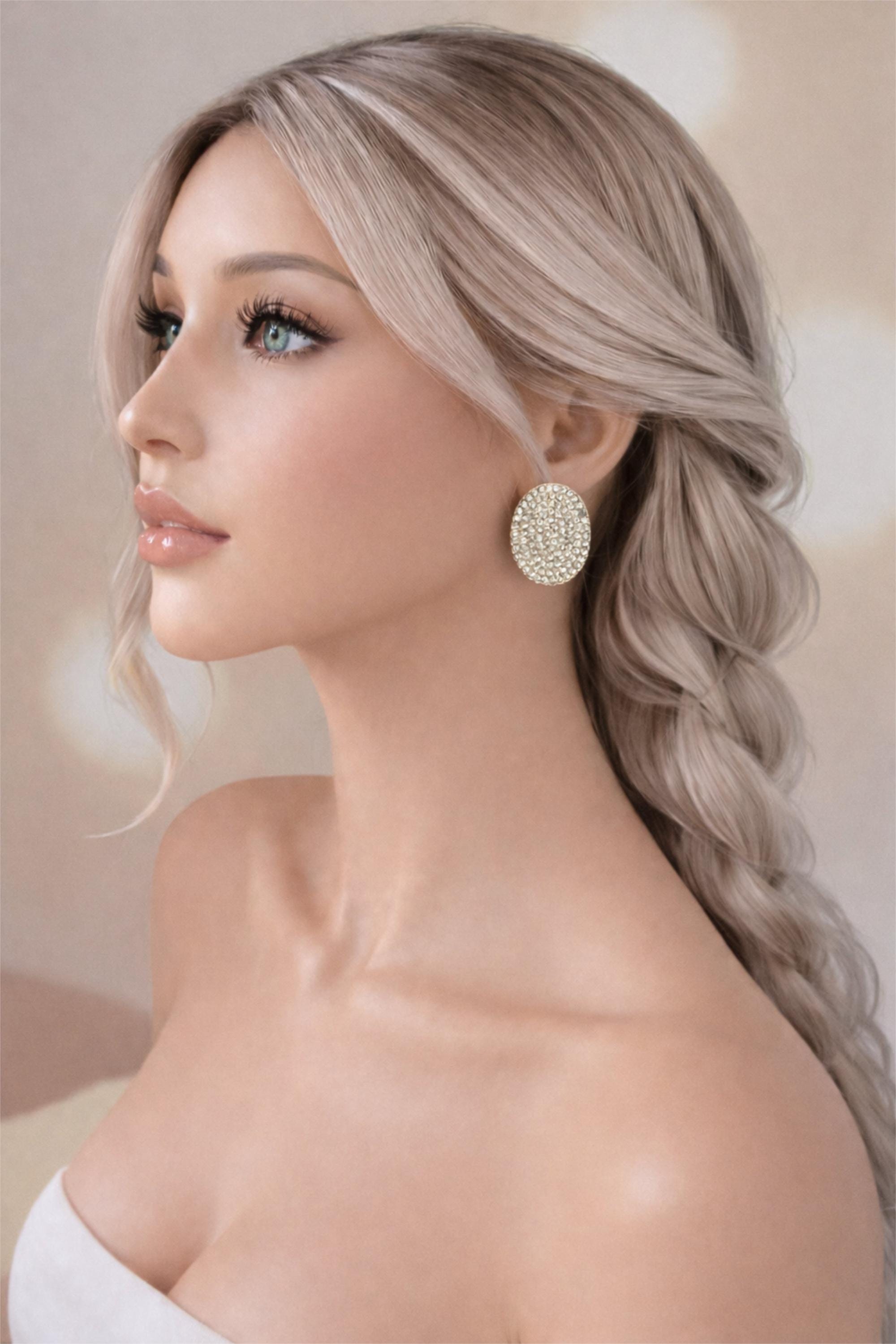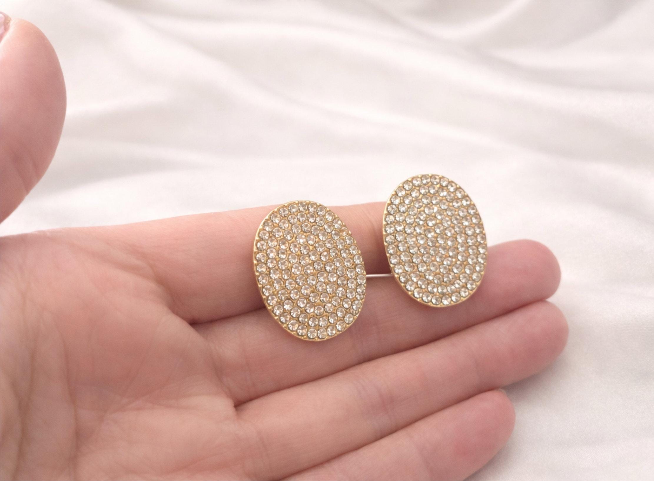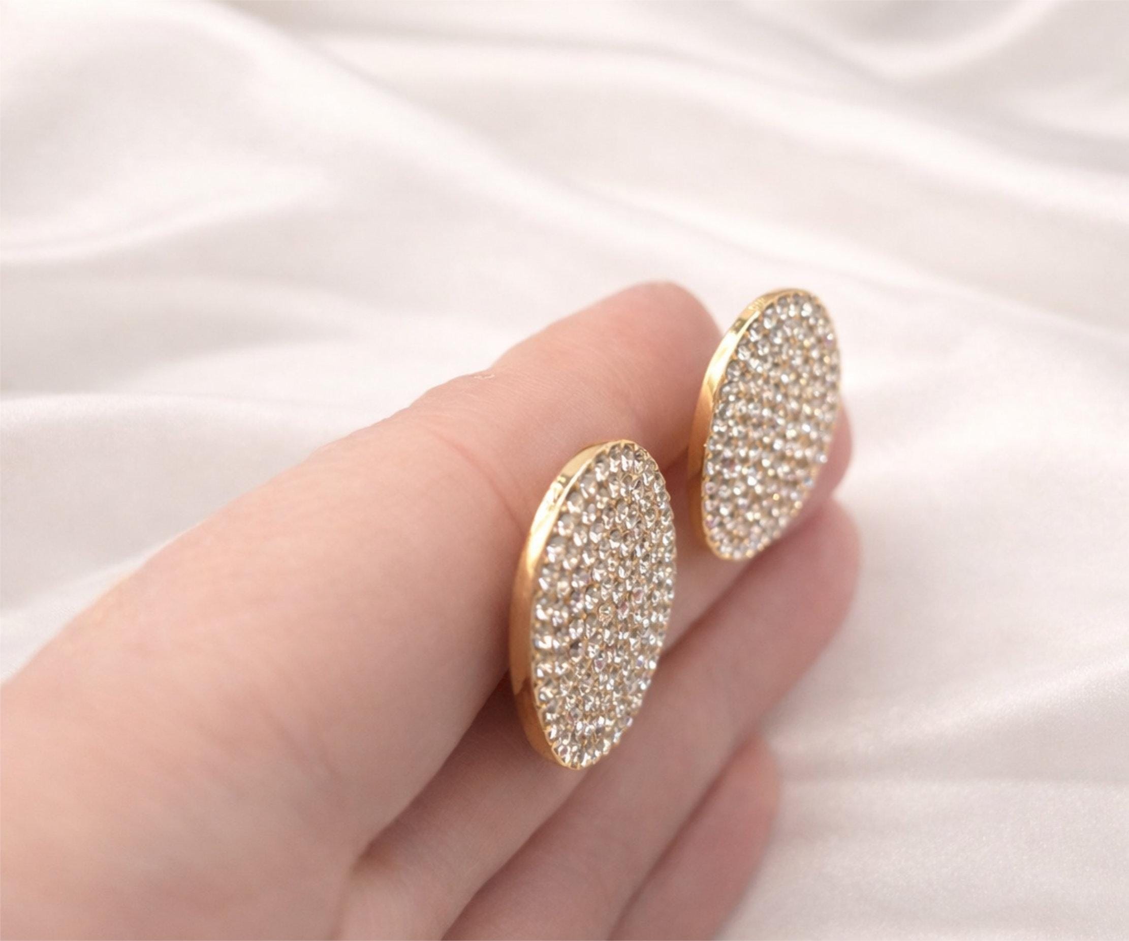 Add instant sparkle with these stunning oval rhinestone stud earrings. Designed with a full pave crystal surface, these statement studs catch the light beautifully and elevate any outfit.