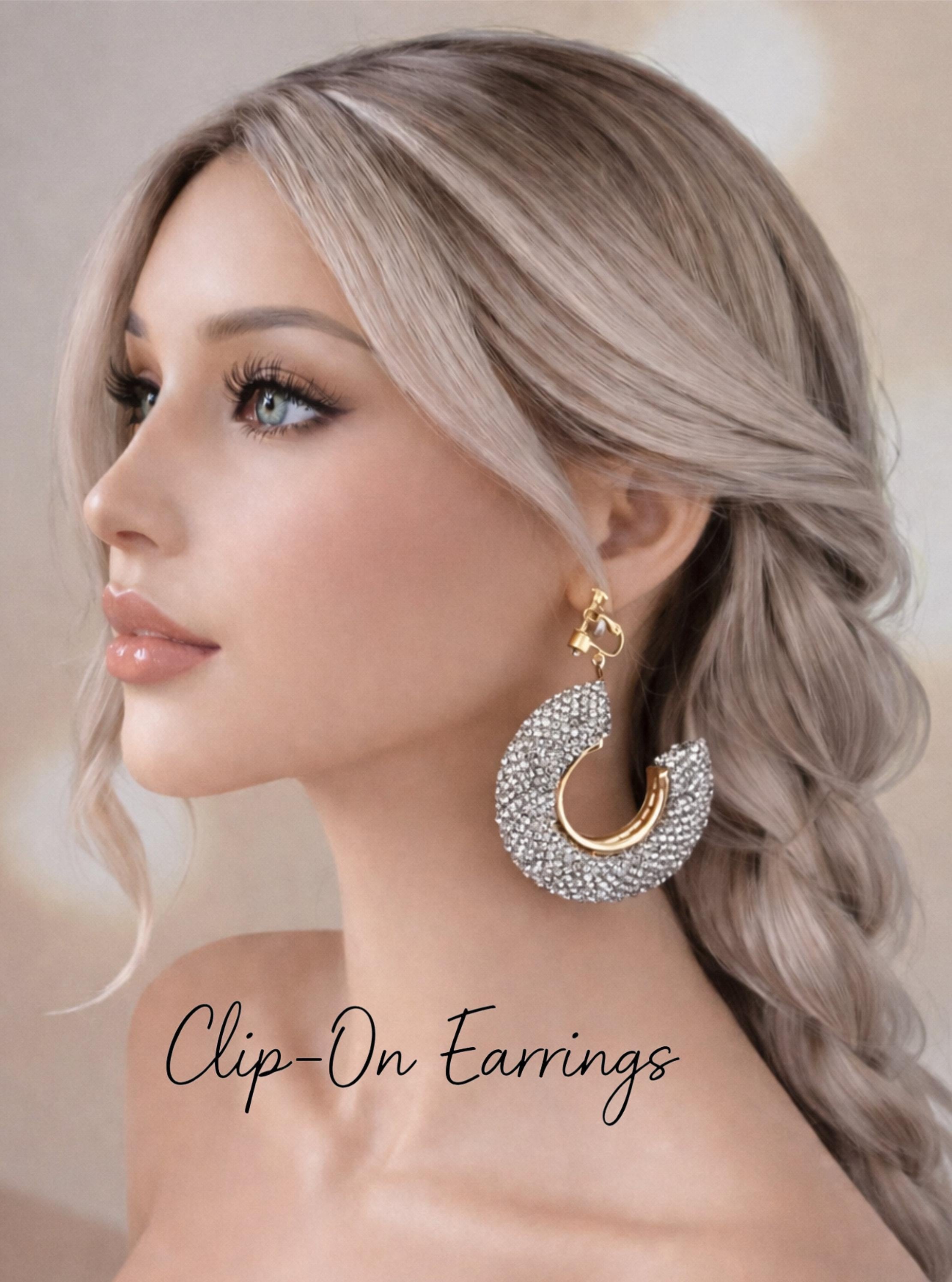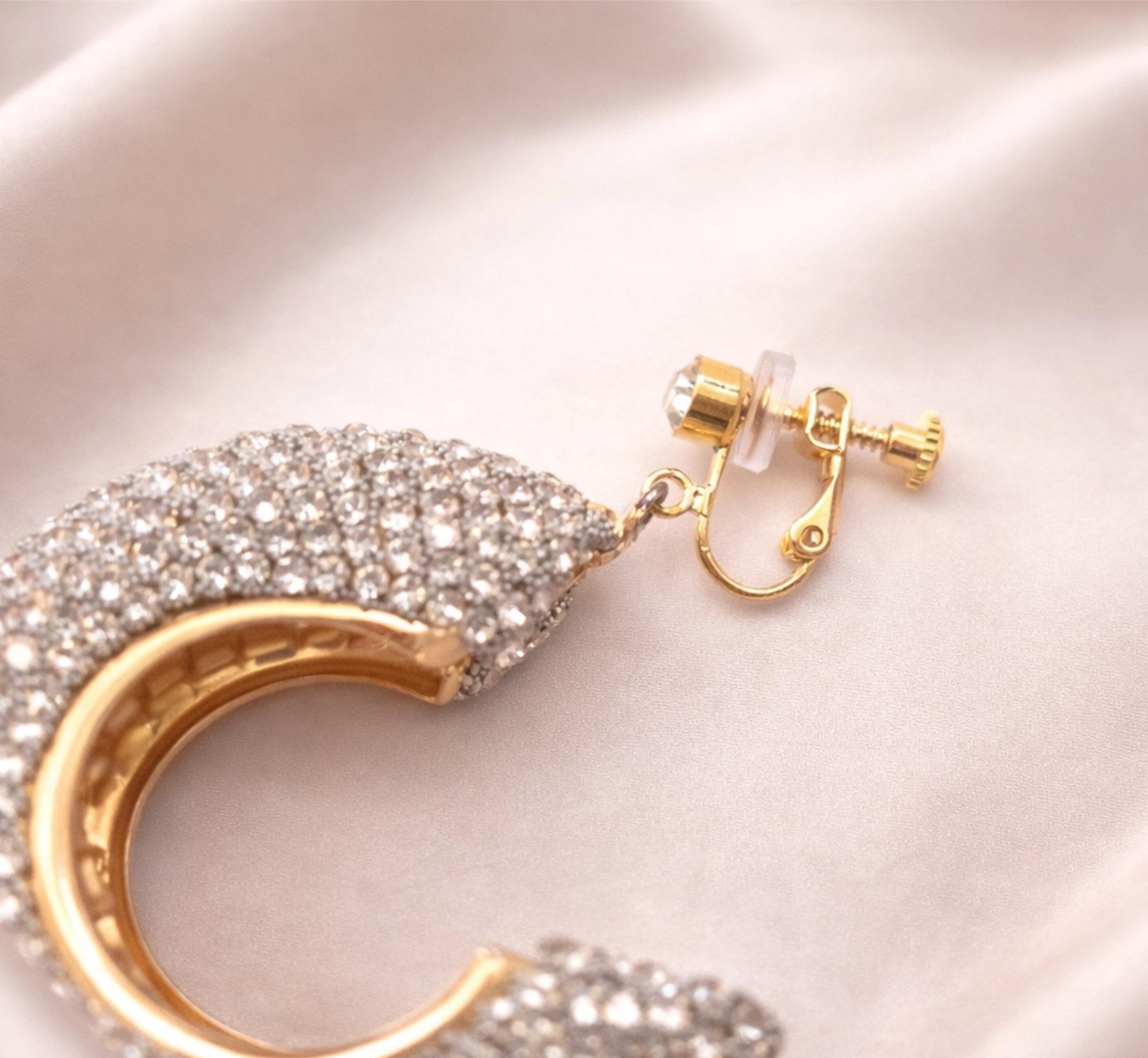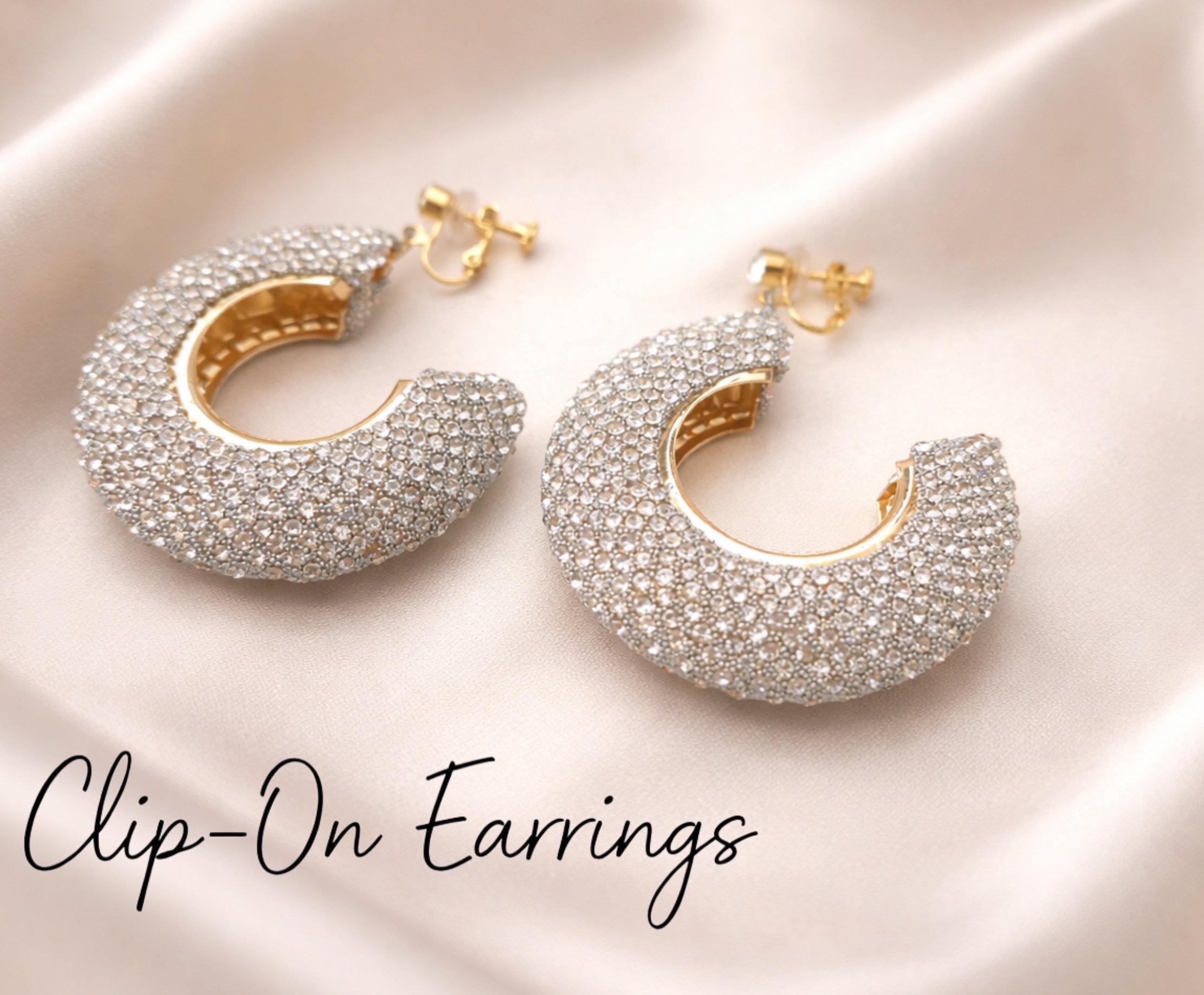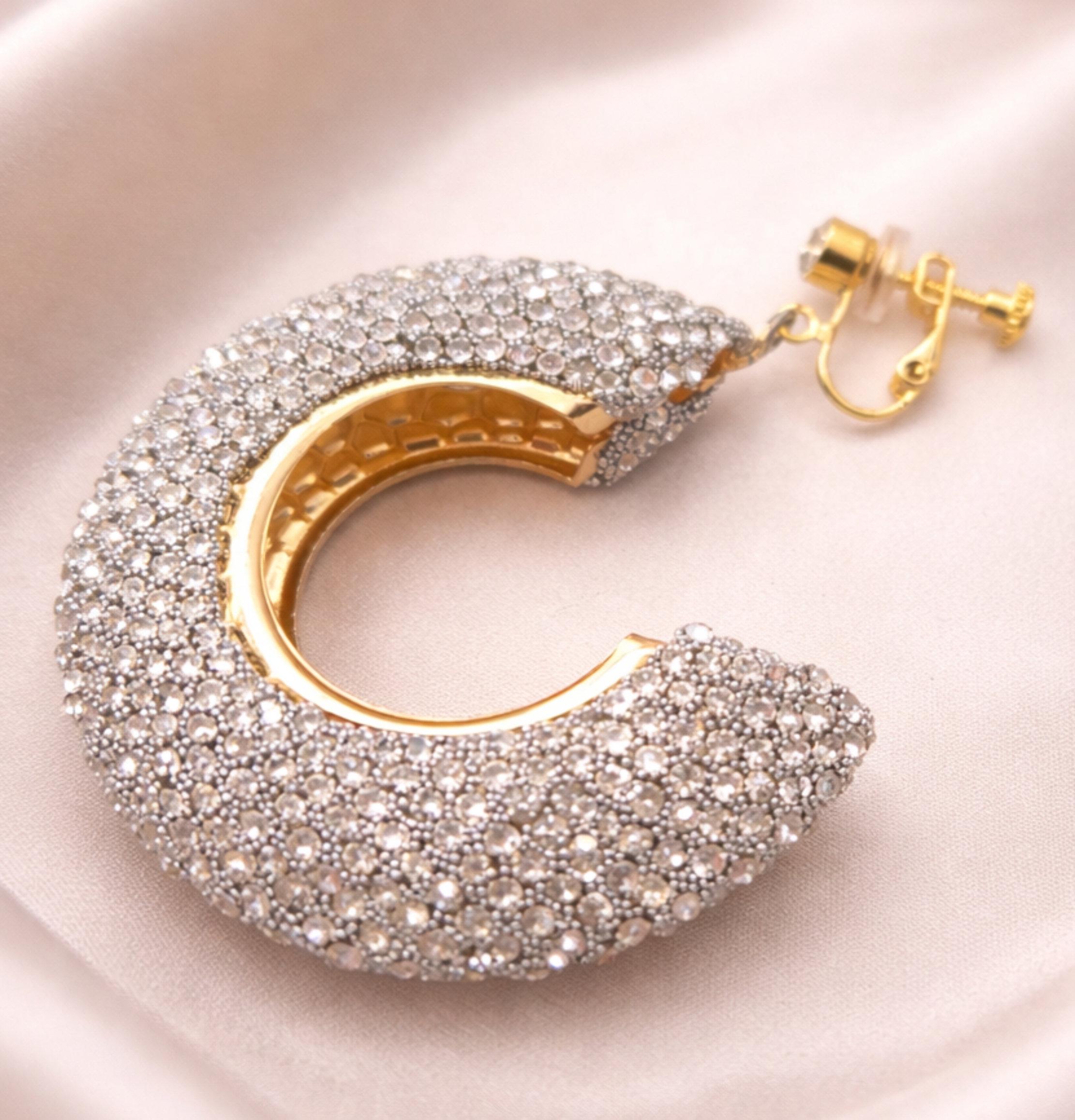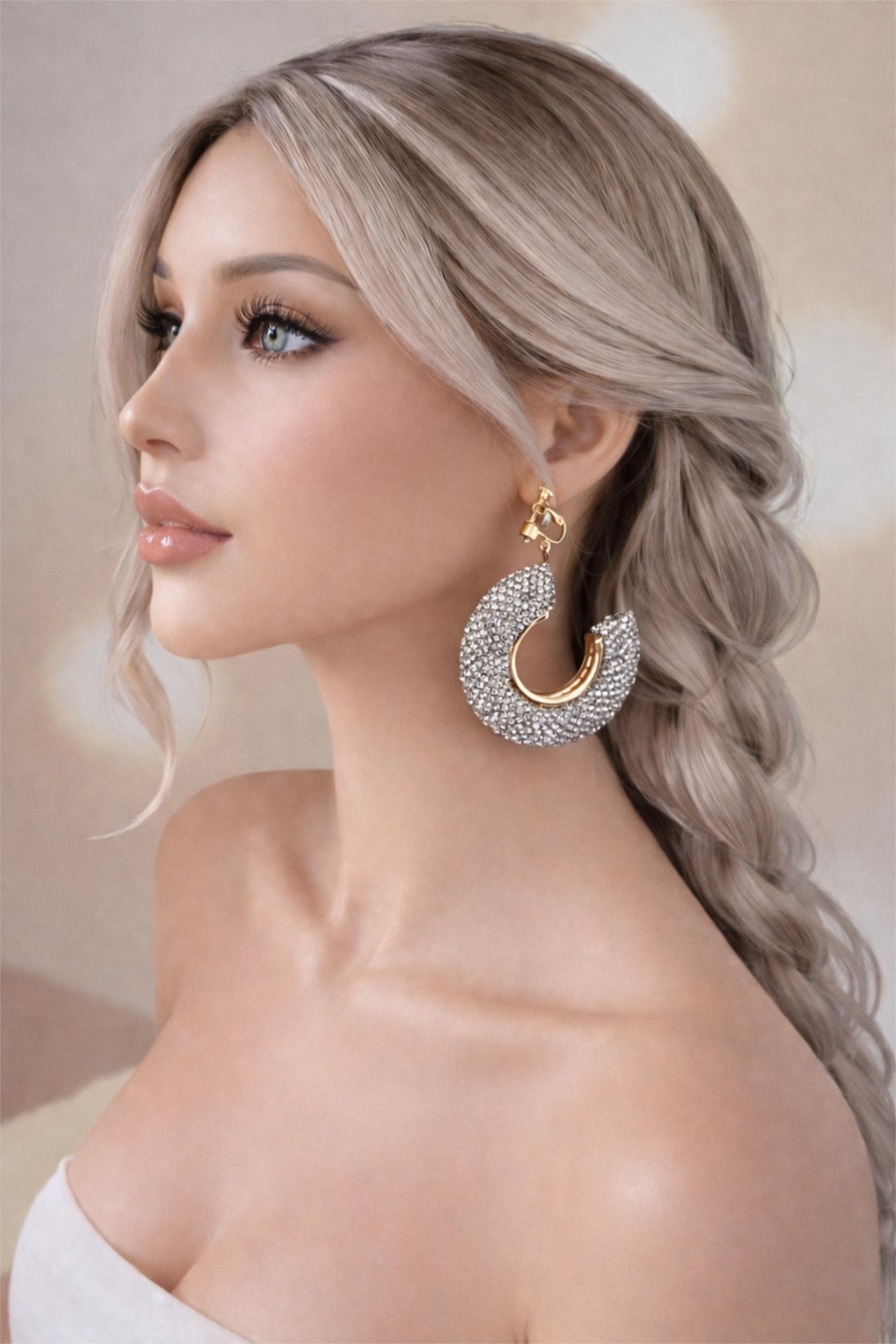 Make a statement with these stunning chunky crescent hoop earrings, fully encrusted with shimmering crystal trim for maximum sparkle. The bold curved design features a smooth gold-tone inner finish, creating a beautiful contrast against the textured rhinestone surface.