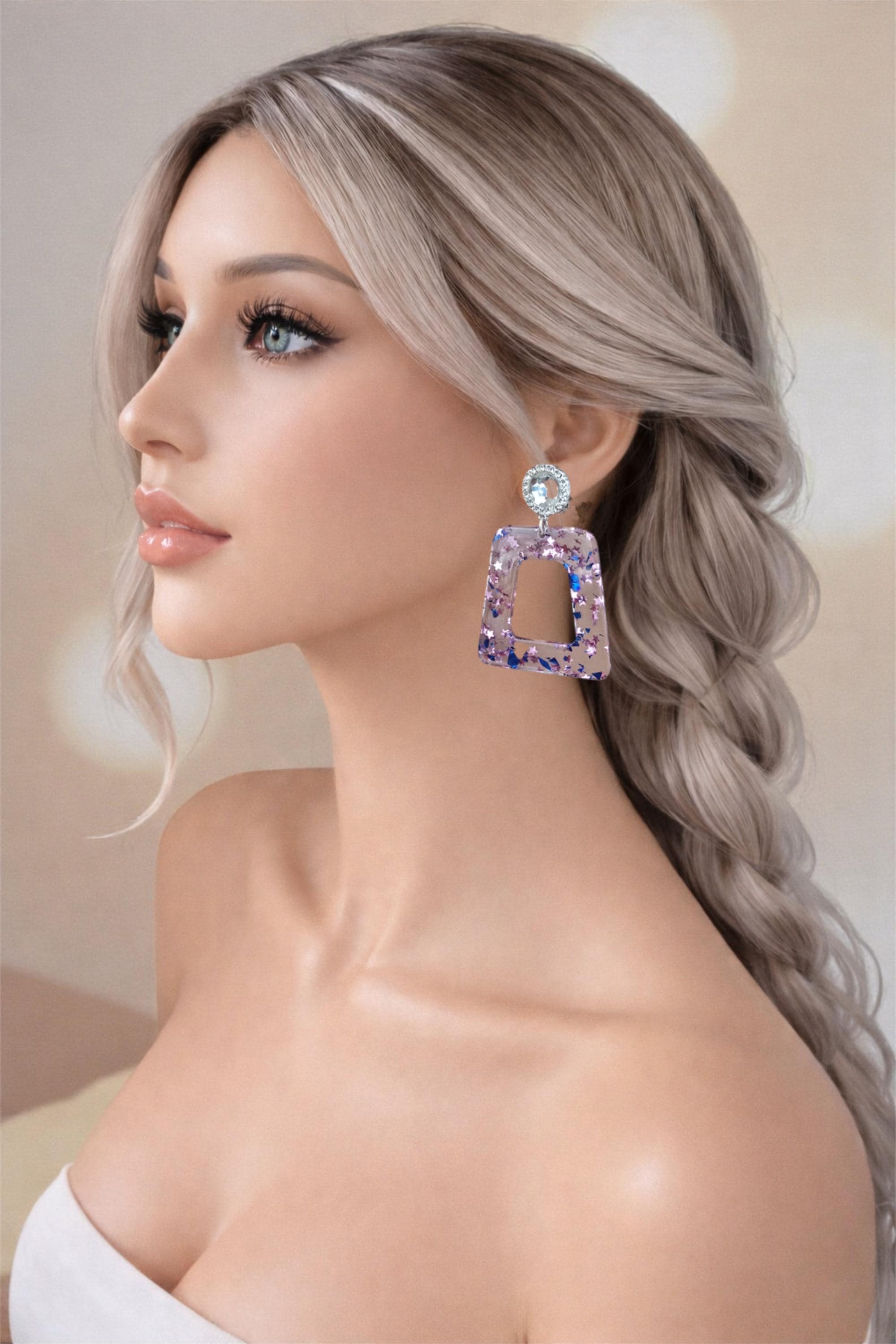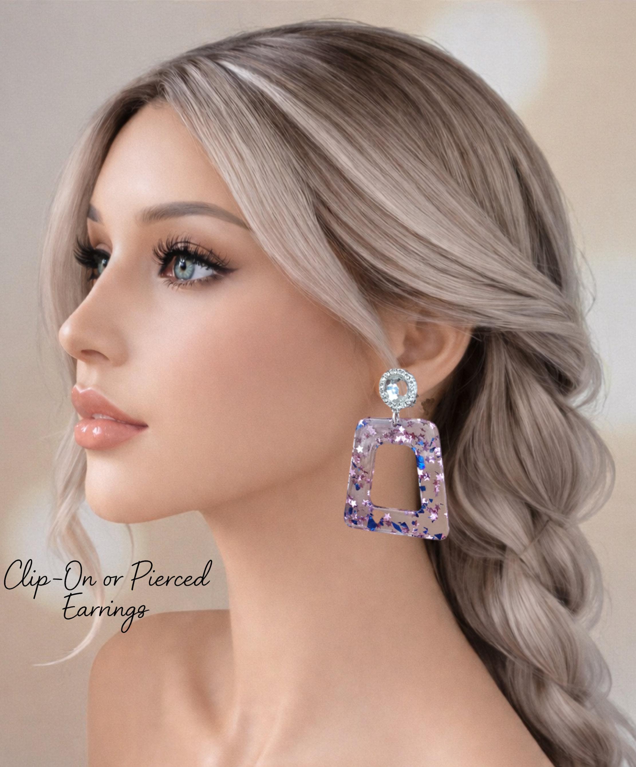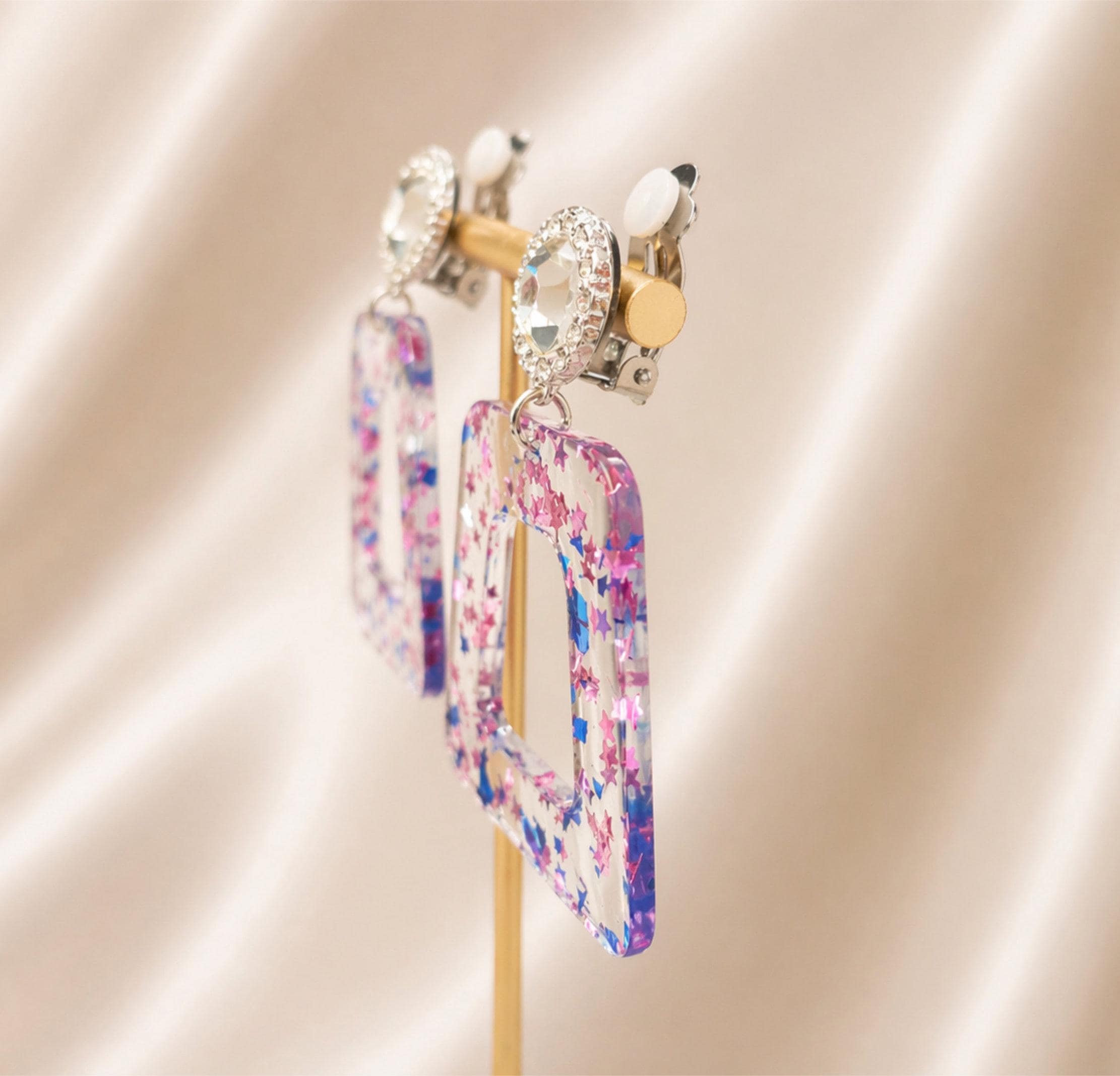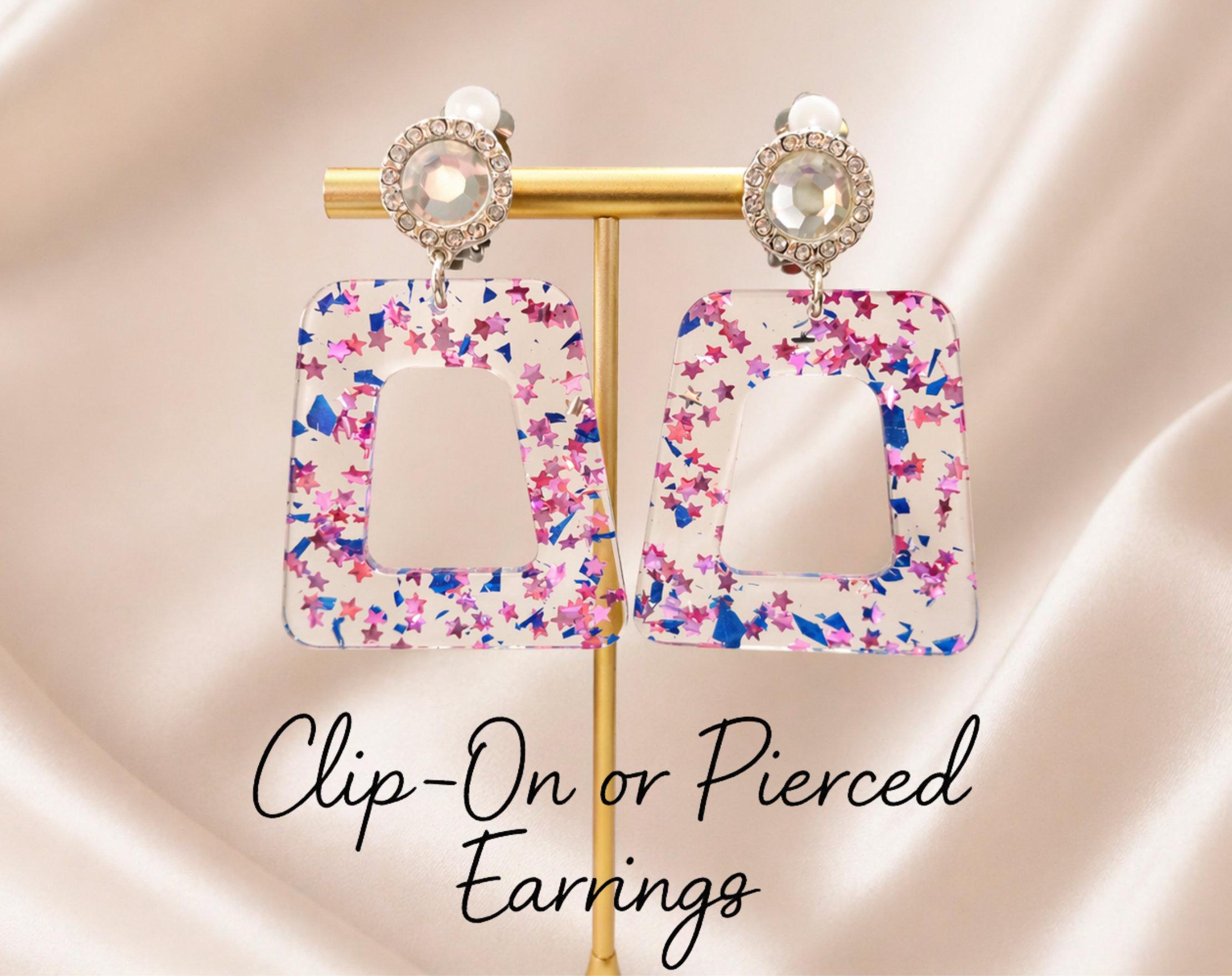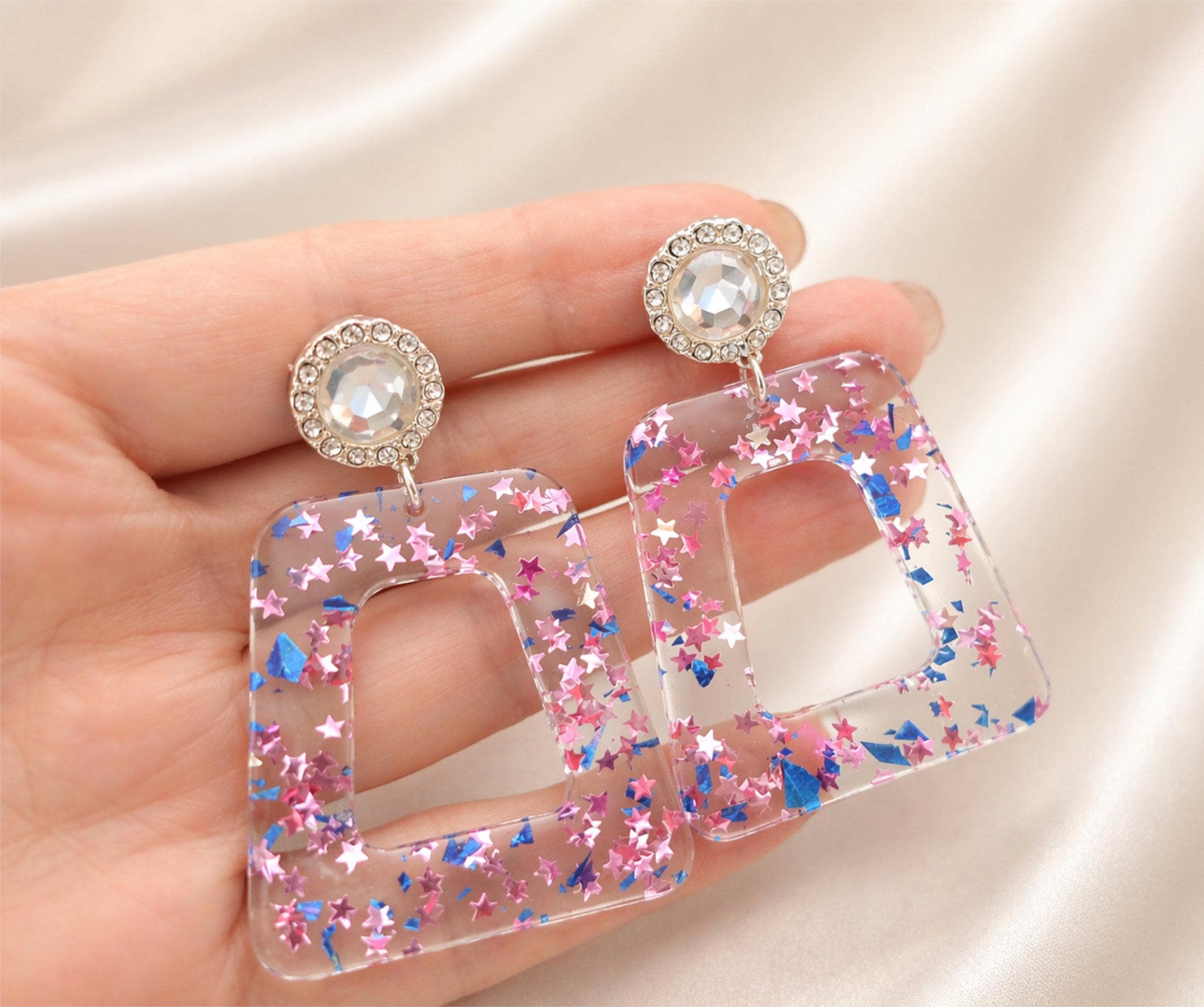 Featuring a sparkling rhinestone stud top paired with lightweight acrylic square drops filled with pink and blue glitter stars & shapes, these earrings are designed to stand out while remaining comfortable to wear all day.