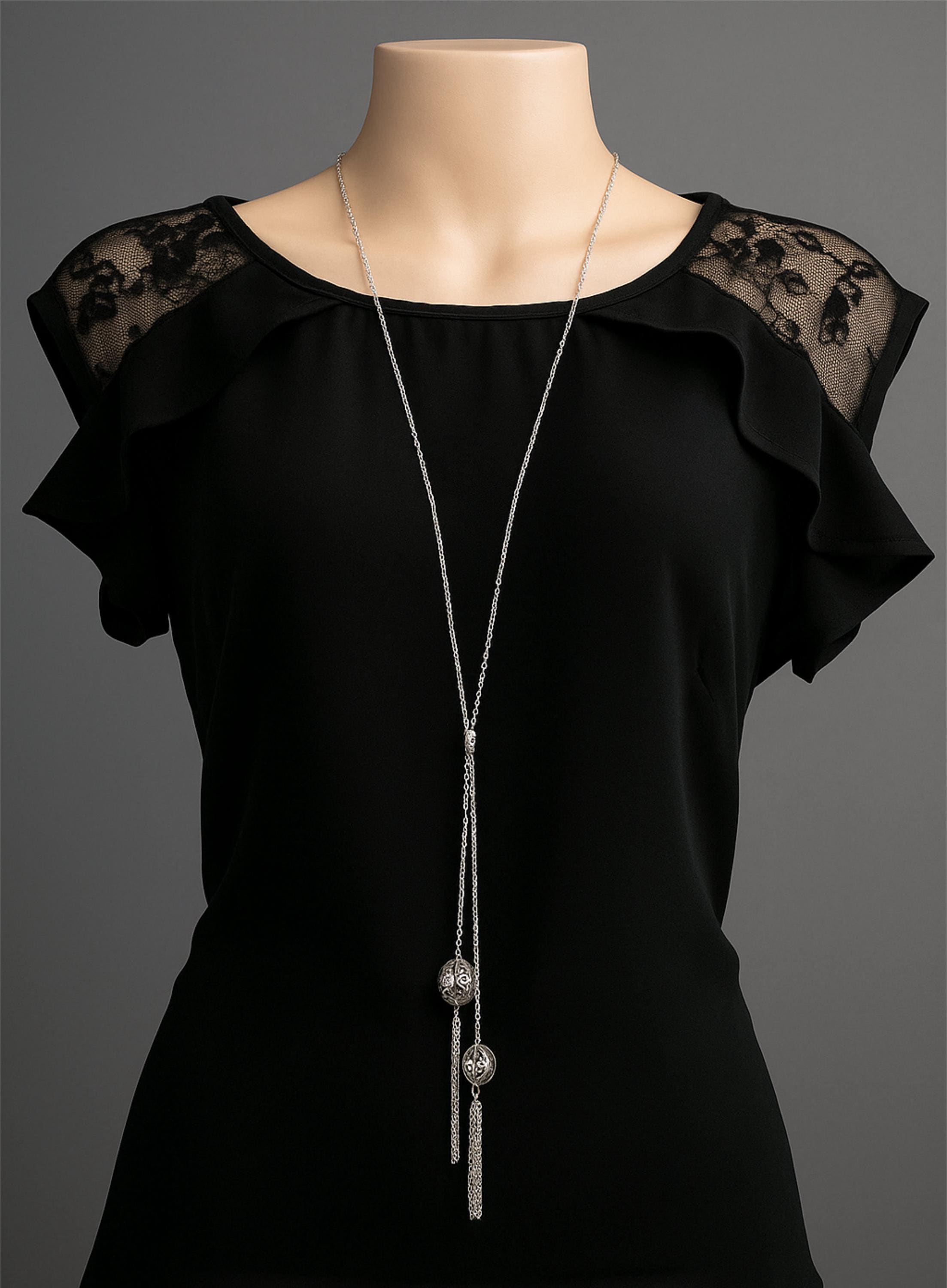 Add effortless elegance to any outfit with this beautifully detailed silver-tone lariat necklace, featuring a sleek knotted design and ornate Tibetan silver beads. Finished with delicate chain tassels, this long layering necklace creates a sophisticated statement whether worn casual or dressed up.