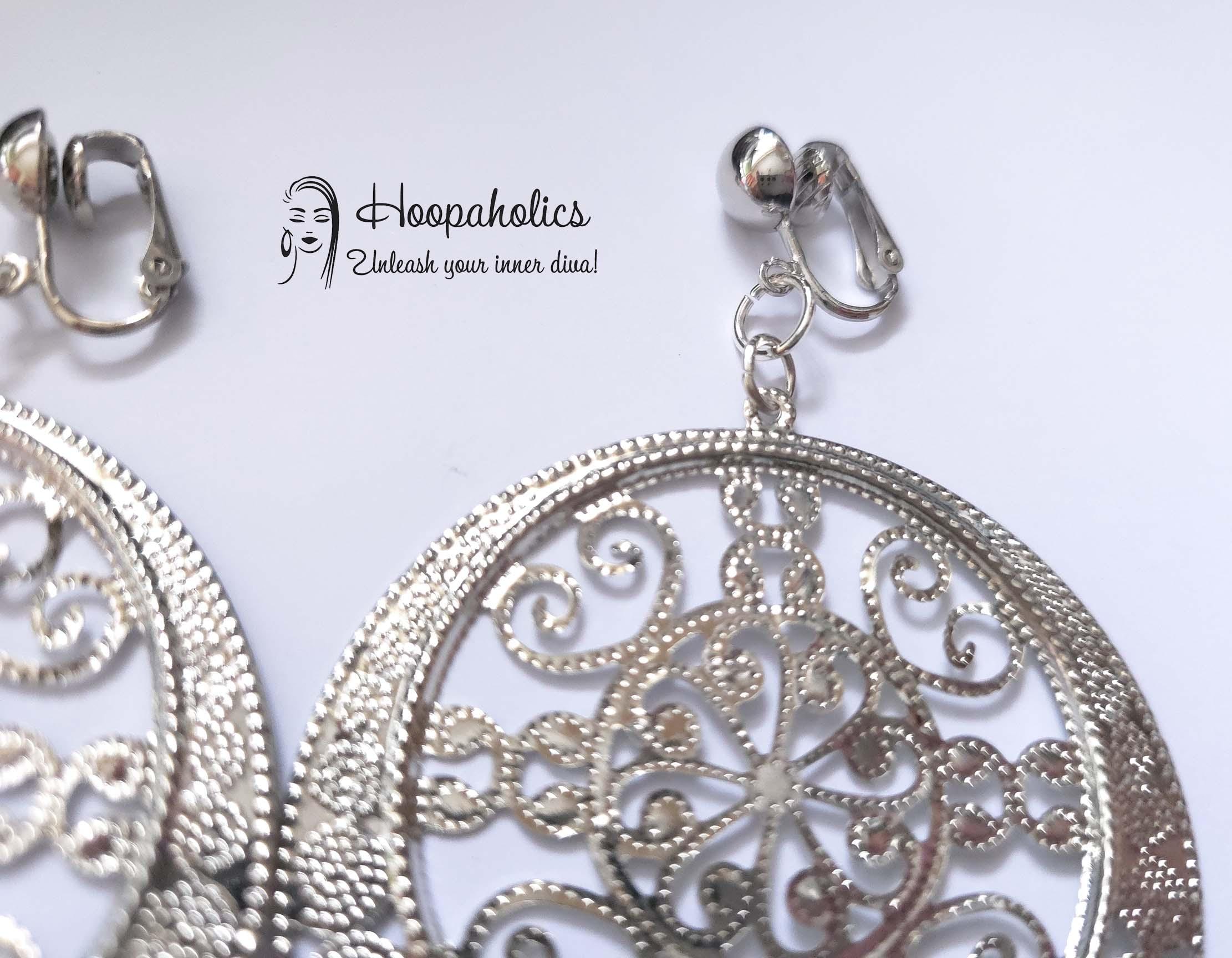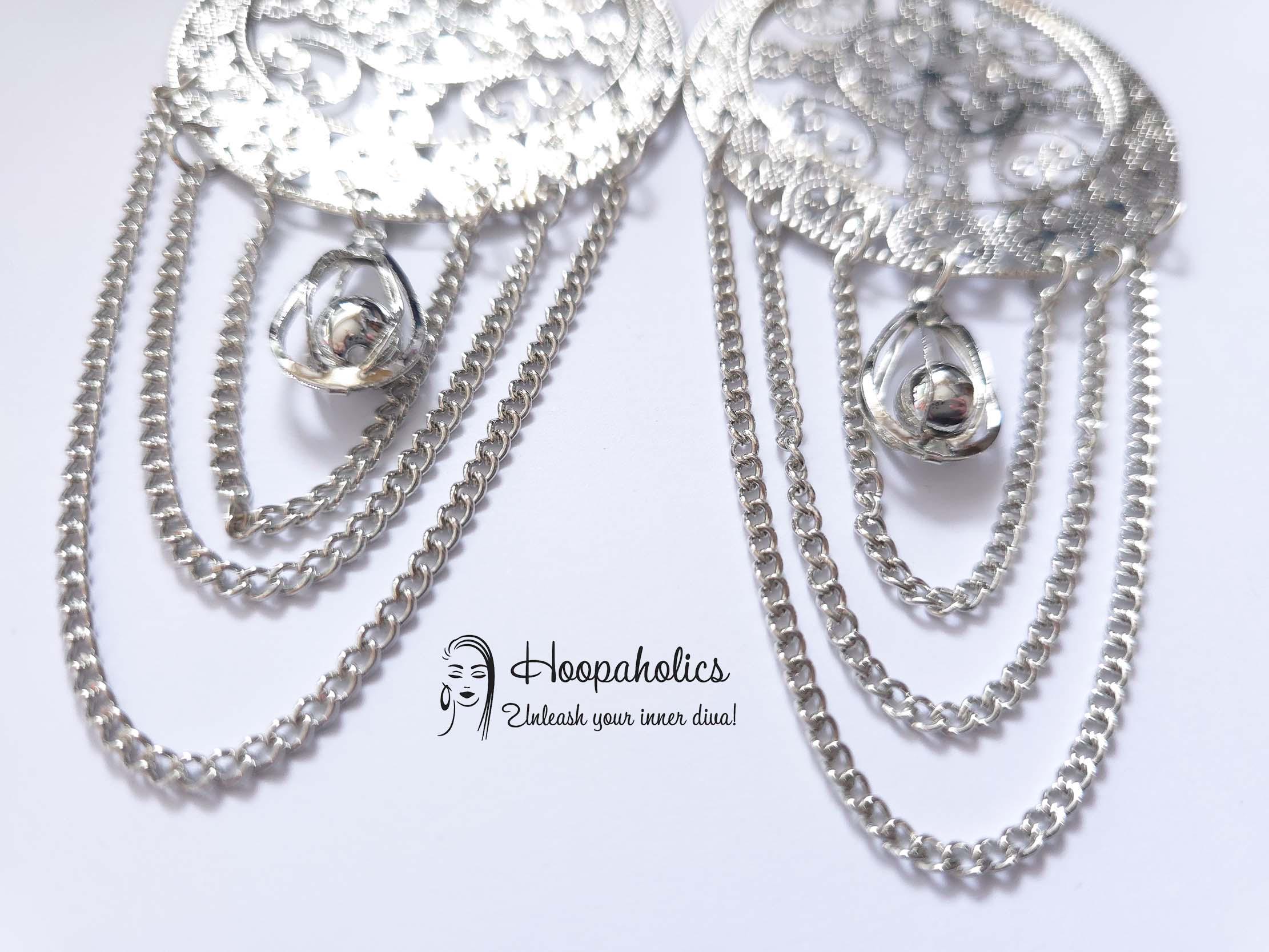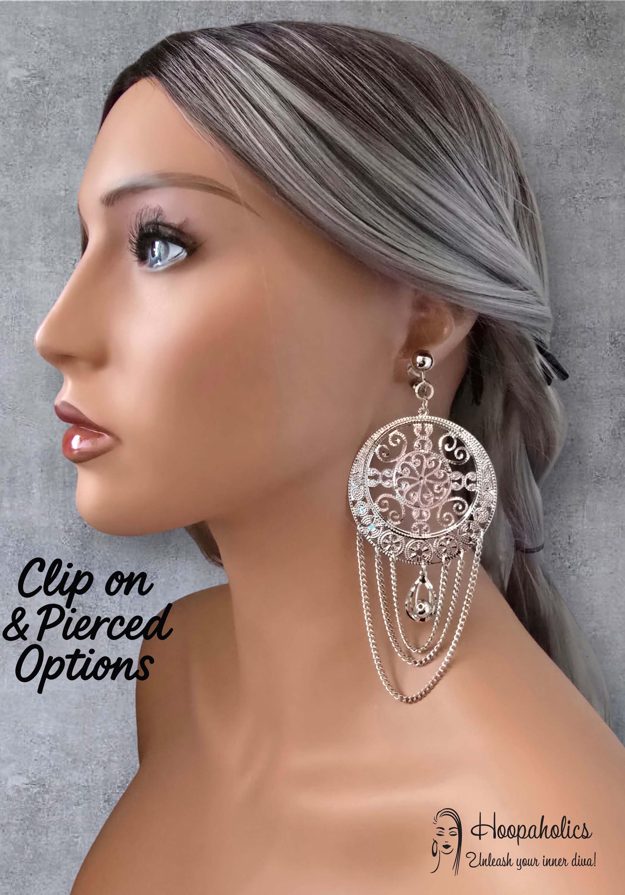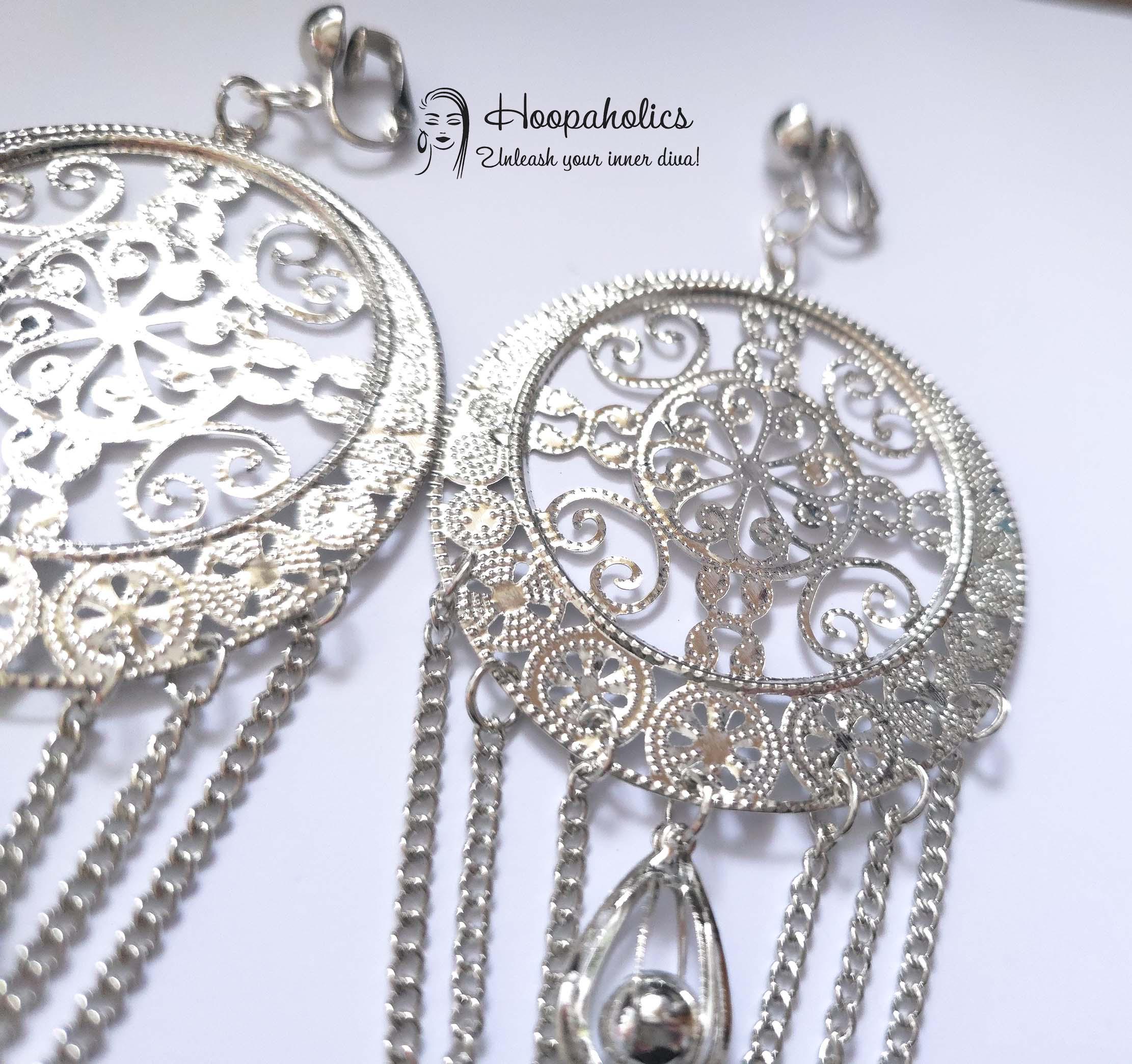 Featuring an intricate circular filigree design with delicate hanging chains and teardrop detailing, these earrings combine vintage charm with modern boho chic.