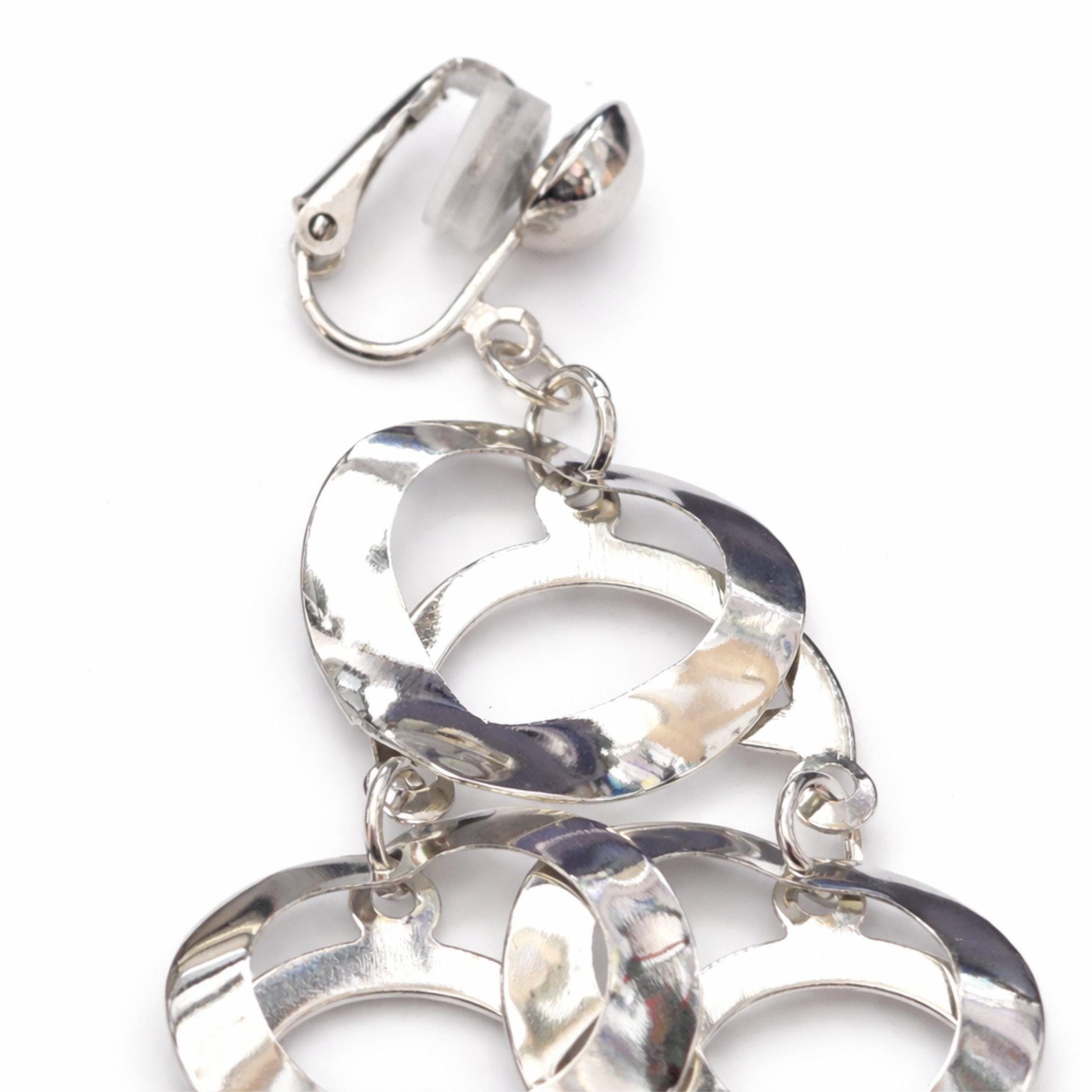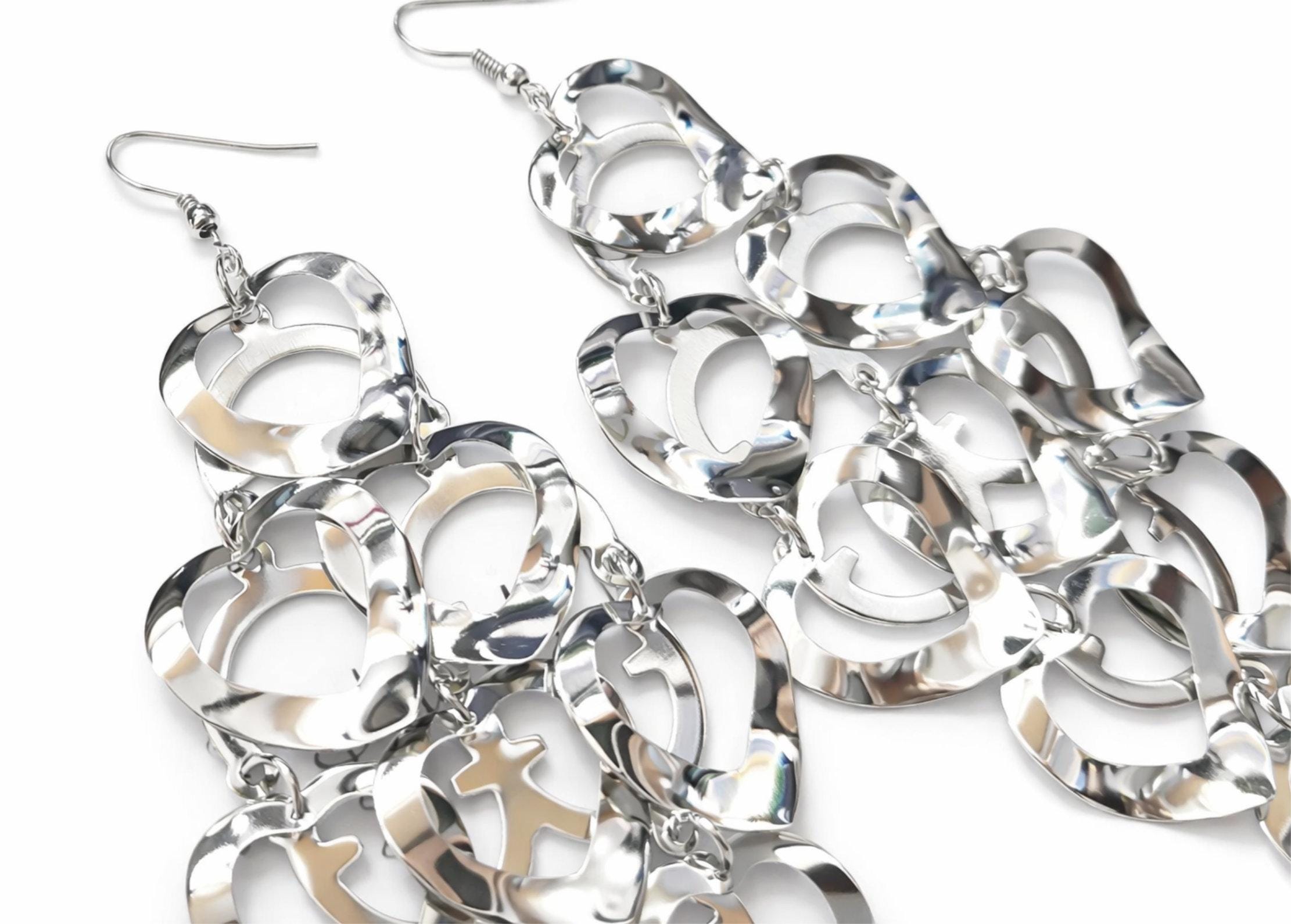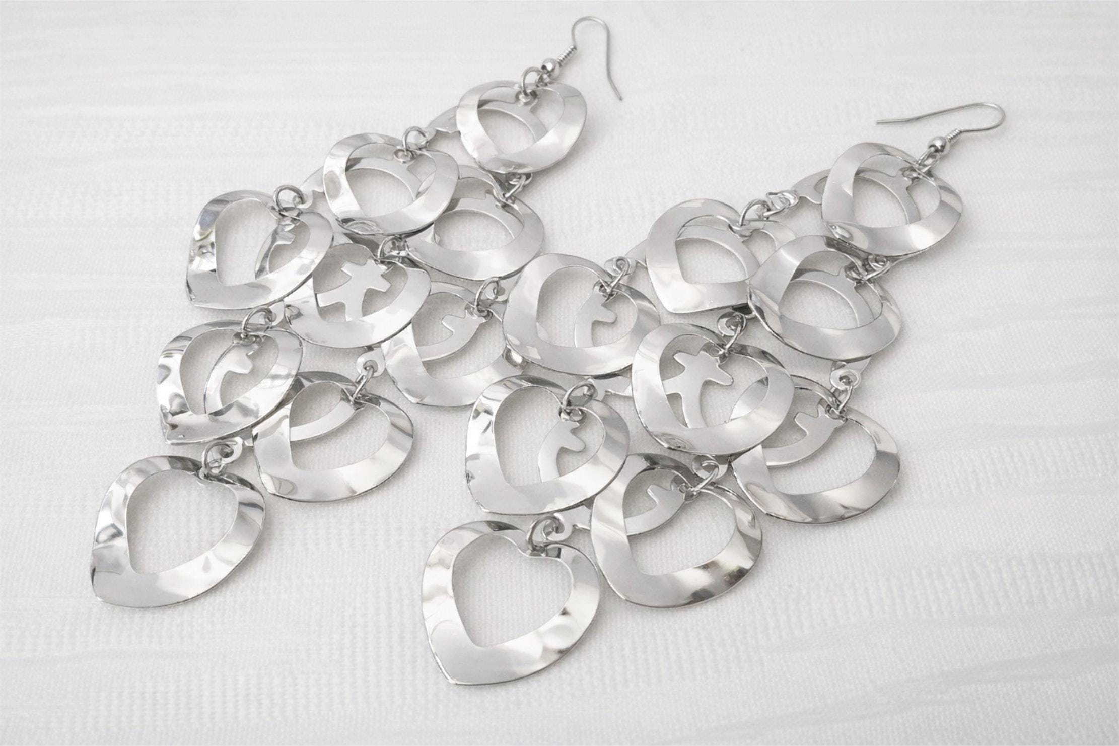 Designed with interlinked polished silver-tone hearts, these long chandelier earrings create beautiful movement and shine with every turn. The reflective finish catches the light effortlessly, giving them a sleek, modern feel while keeping a soft, feminine silhouette.