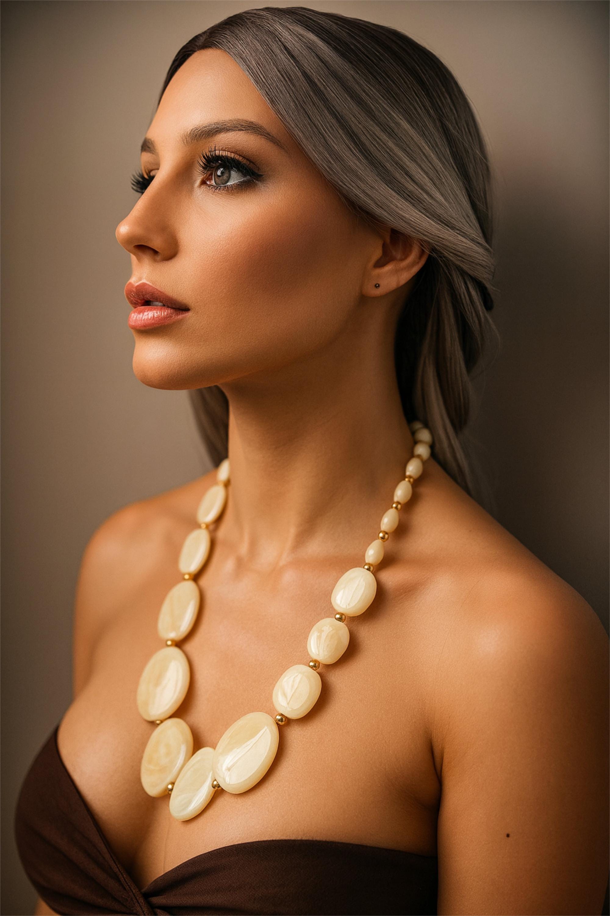 Add a touch of elegant vintage charm to your outfit with this chunky cream statement necklace, beautifully designed with smooth oval resin beads and delicate gold accents. The warm ivory tone makes it a perfect accessory for any season — ideal for weddings, evenings out, special occasions, or elevating your everyday style.